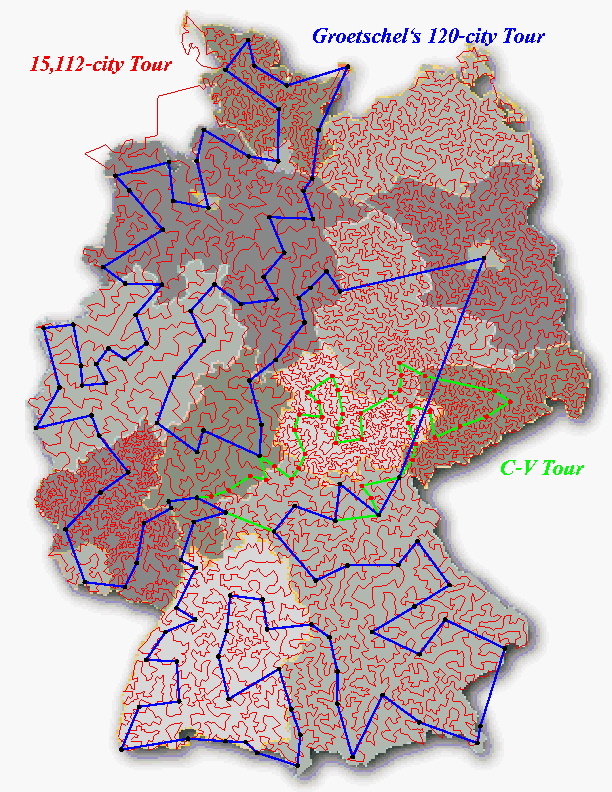 In the following figure we present the three German tours. The Alten Commis-Voyageur tour is given in green, Groetschel's tour in blue, and the 15,112-city tour in red.