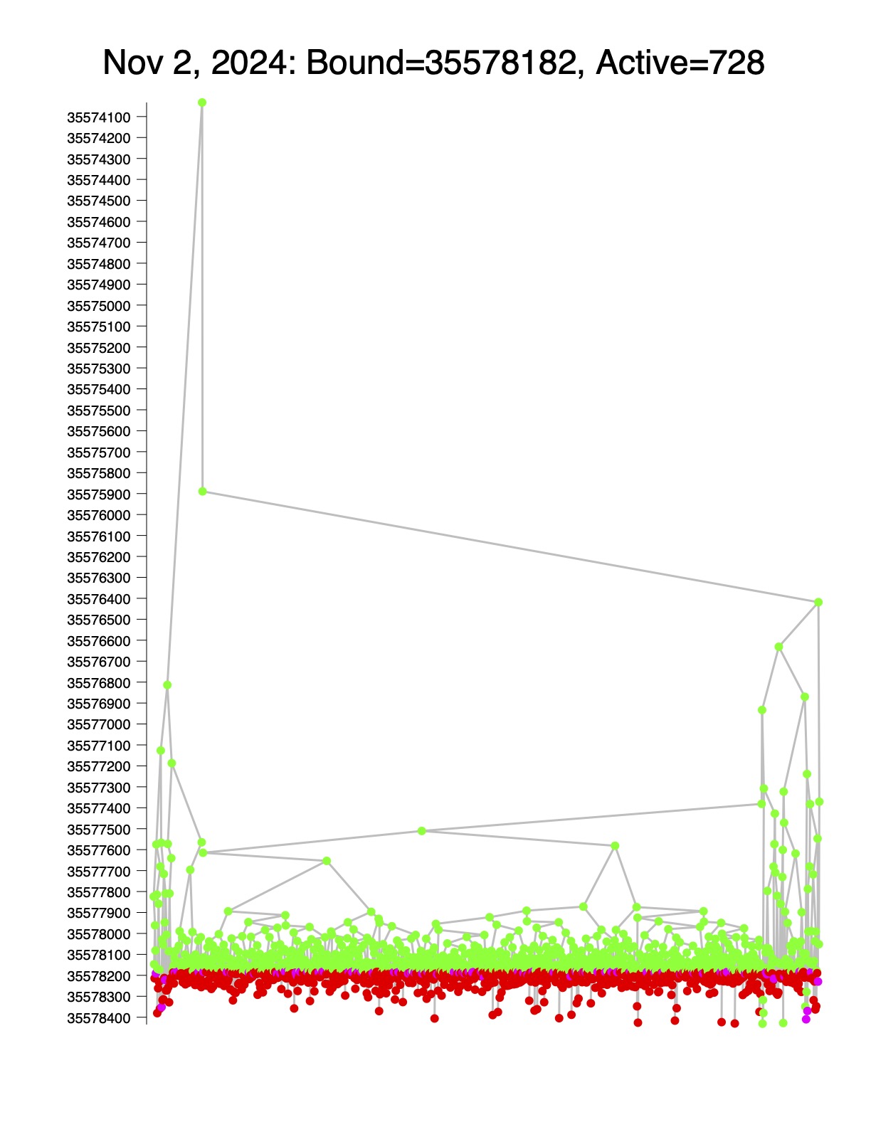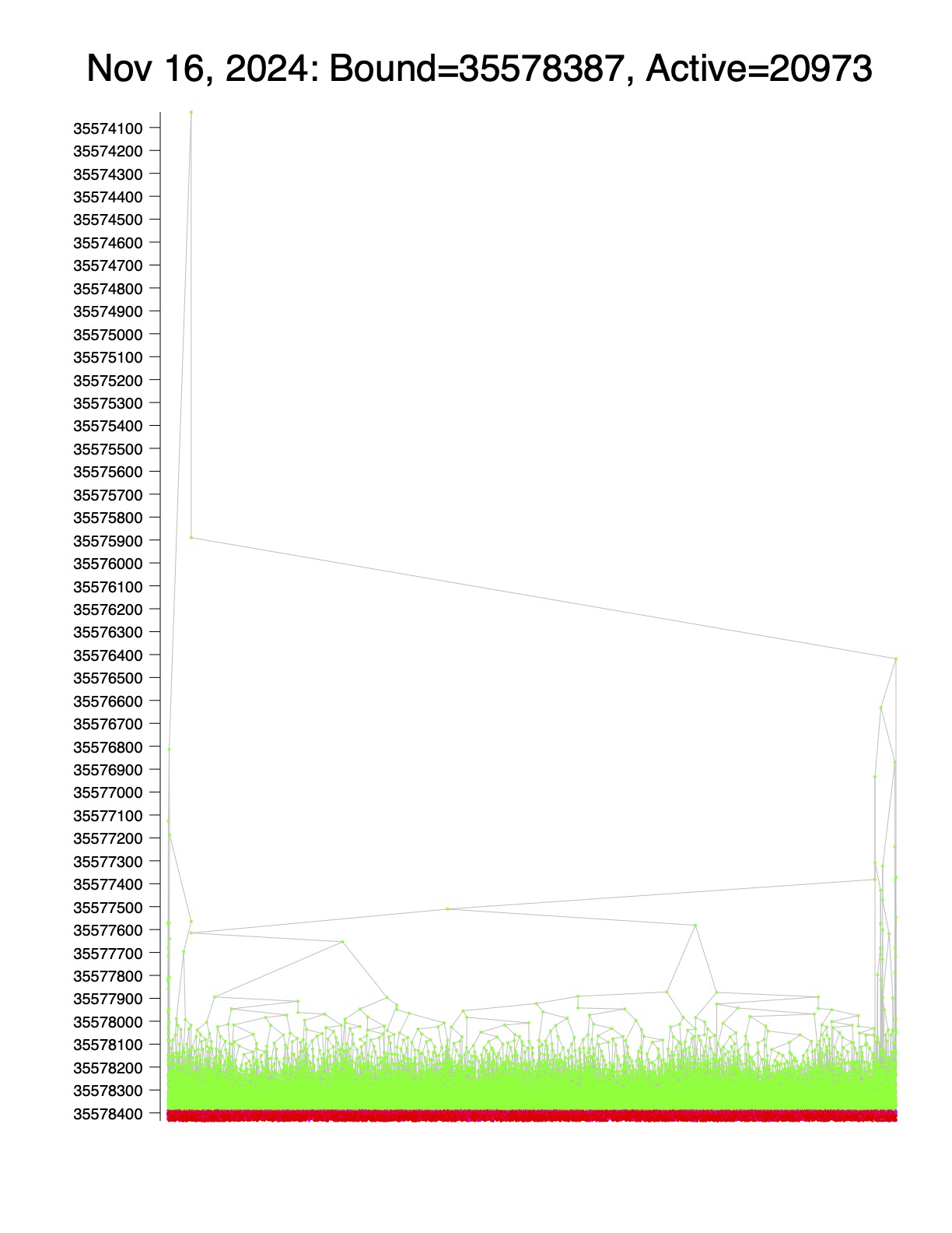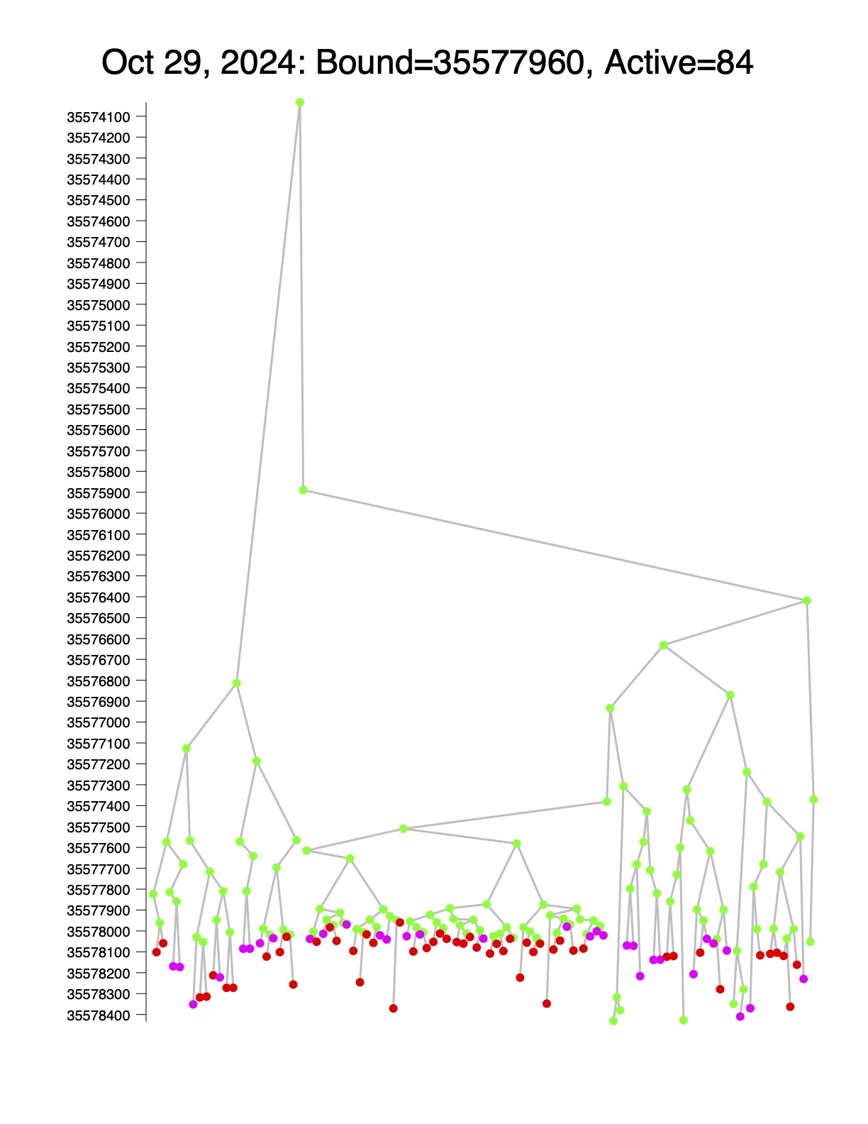 At the top of each image, we display the lower bound established by the search and the number of active subproblems. Notice the red/magenta line of active nodes slowly moving down the images, as the search progresses to better and better lower bounds.