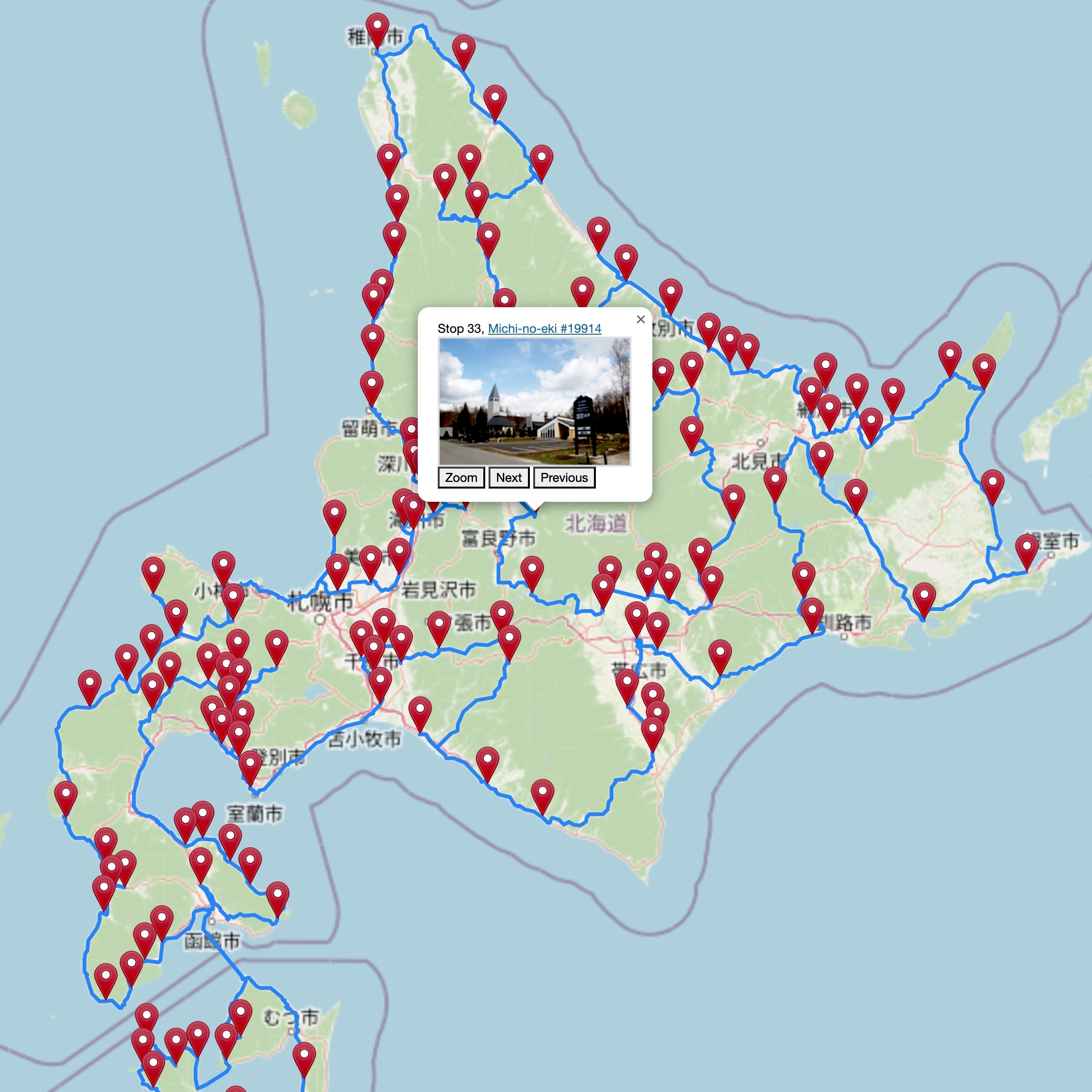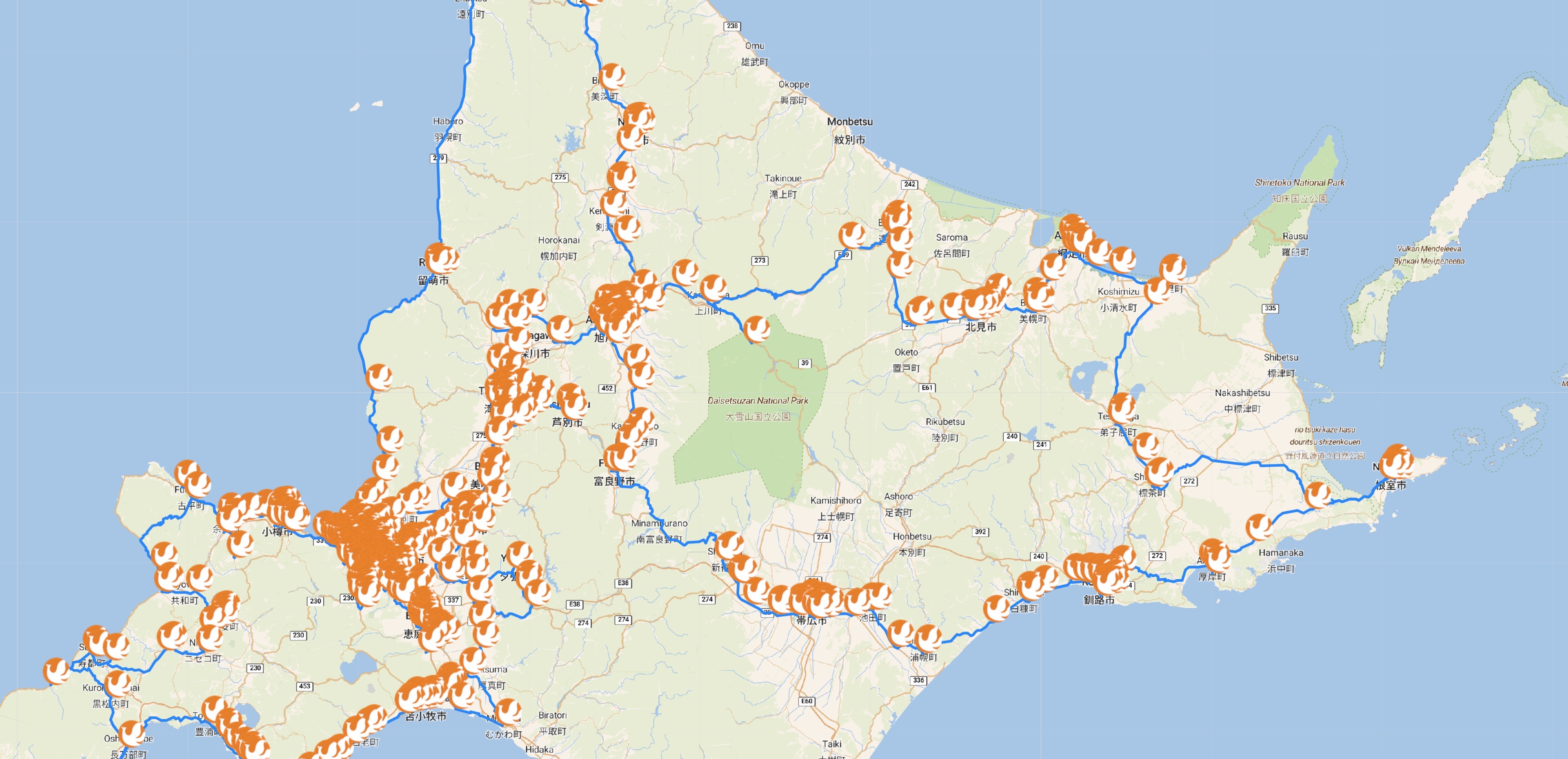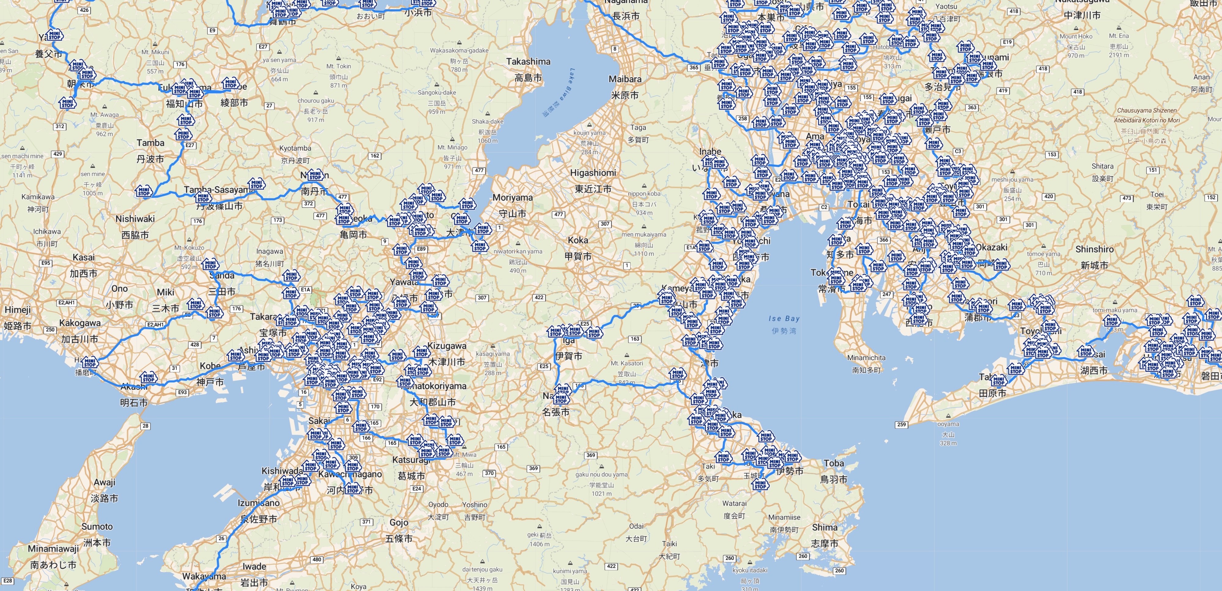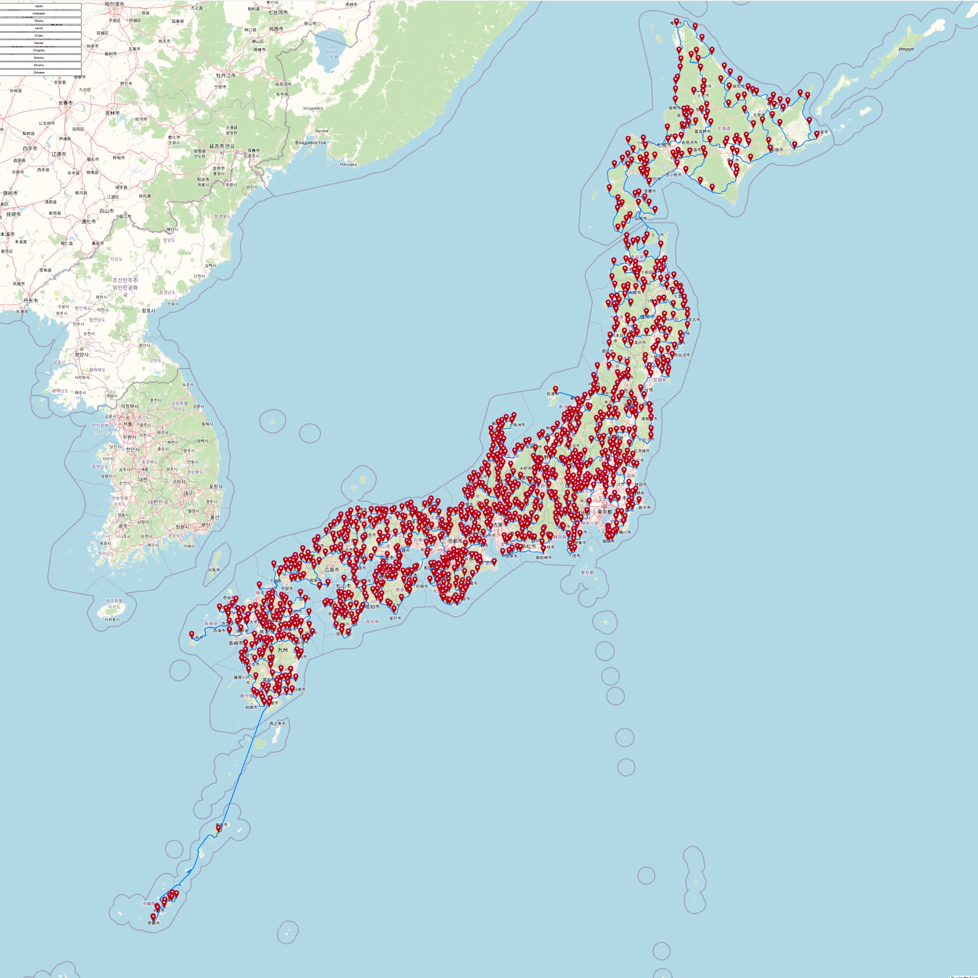 The tours for five of the six individual chains of convenience stores visit all of the stops included in konbini40426. For the Seicomart tour we restricted the tour to Hokaiddo, to avoid a long ferry trip to pick up the small number of shops outside the island. If you are interested in seeing the optimal routes, use the buttons in the blocks below to view interactive maps and high-resolution images.