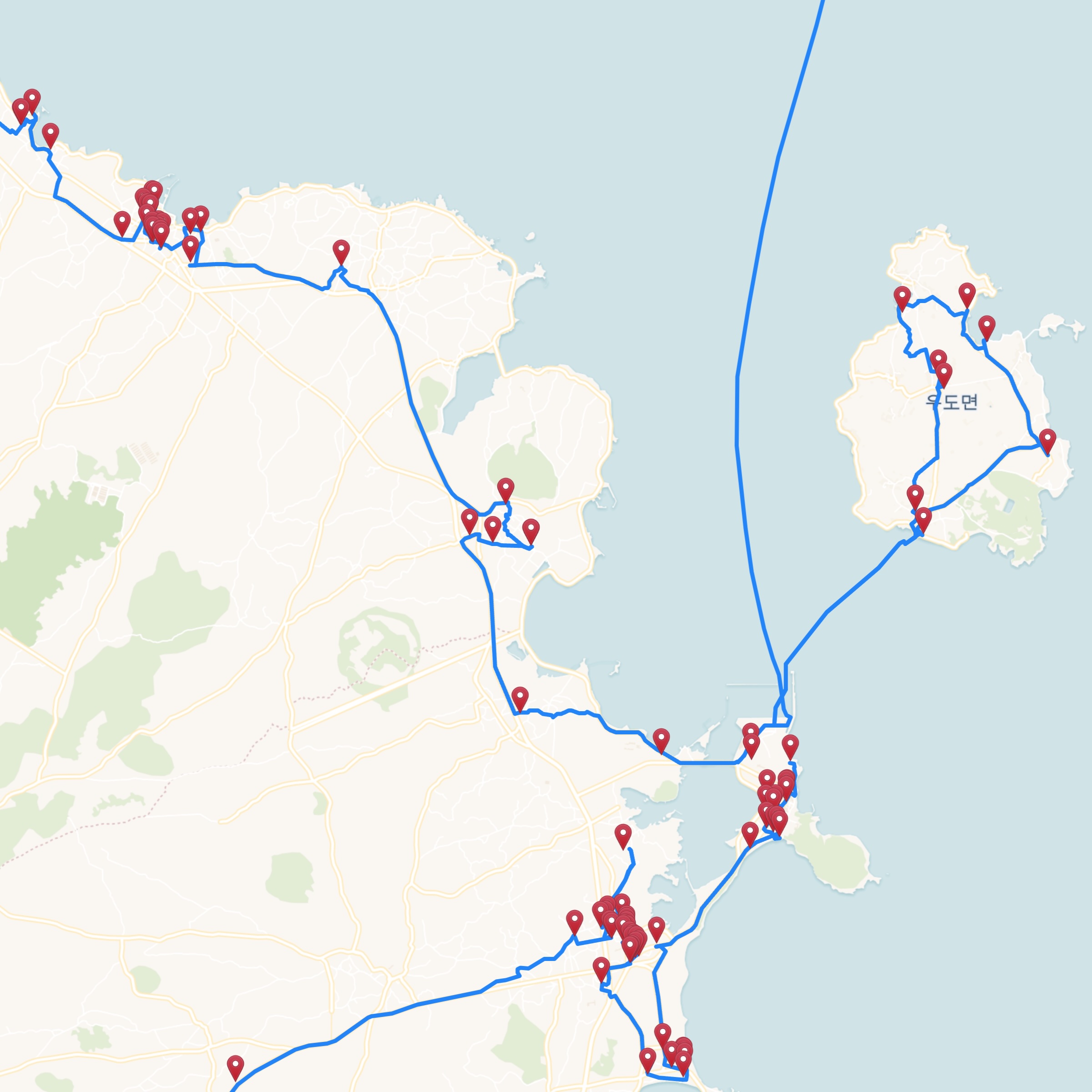 You can get a feeling for the complexity of the optimal tour by examining how it passes along small roads and paths to visit neighborhood bars. To allow this, without the considerable lag time when navigating the full-tour map, we created an interactive map that contains only regions around a number of Korean cities.