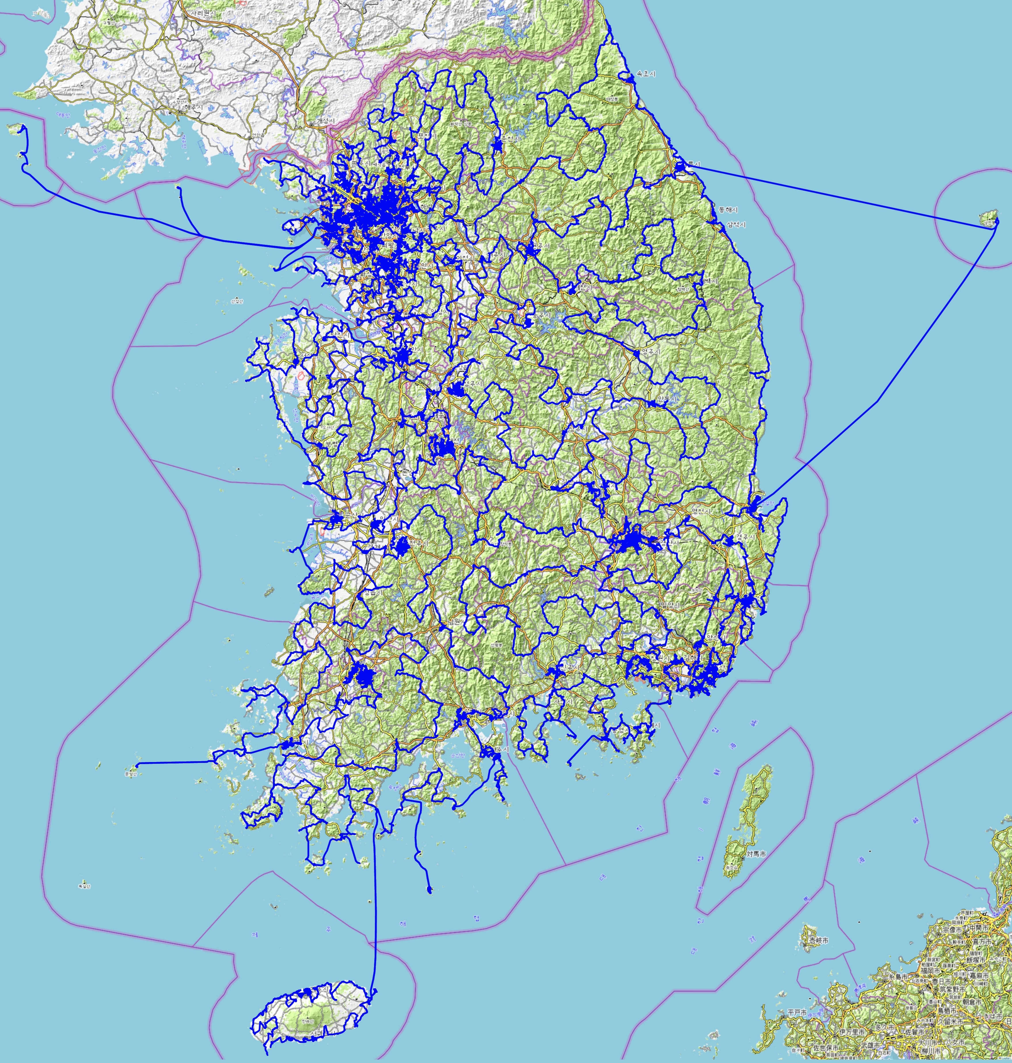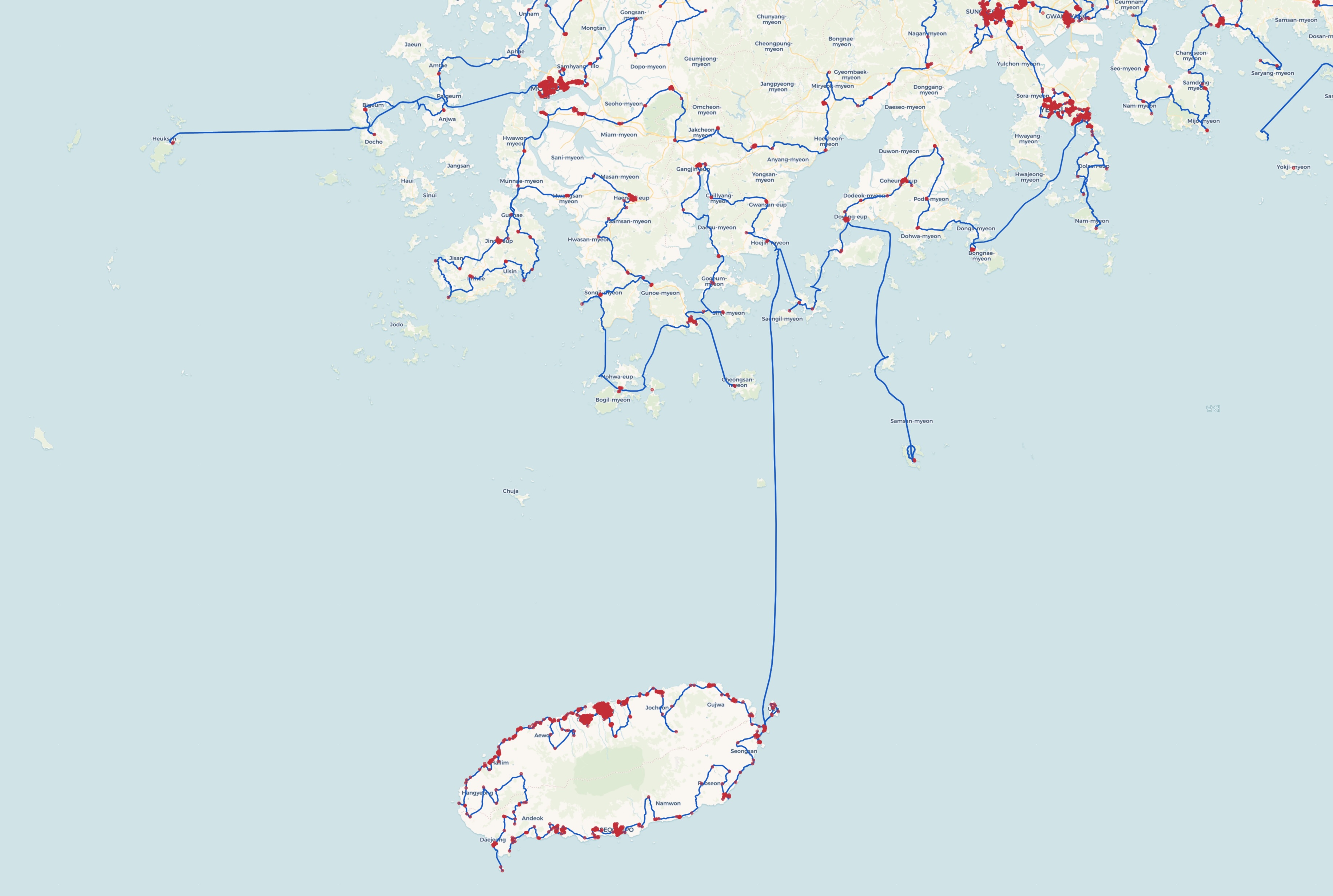 The figure below is a screen shot of an interactive map of the korea81998 tour. The menu on the left-hand-side lets you select one of seven regions to view. At the top right-hand-side you can choose to have either a colored street map or a grayscale map without street labels. Just below this menu you can select whether or not to display the stop markers, or to display the tour edges, or to display both. You can view the map by clicking on the image.