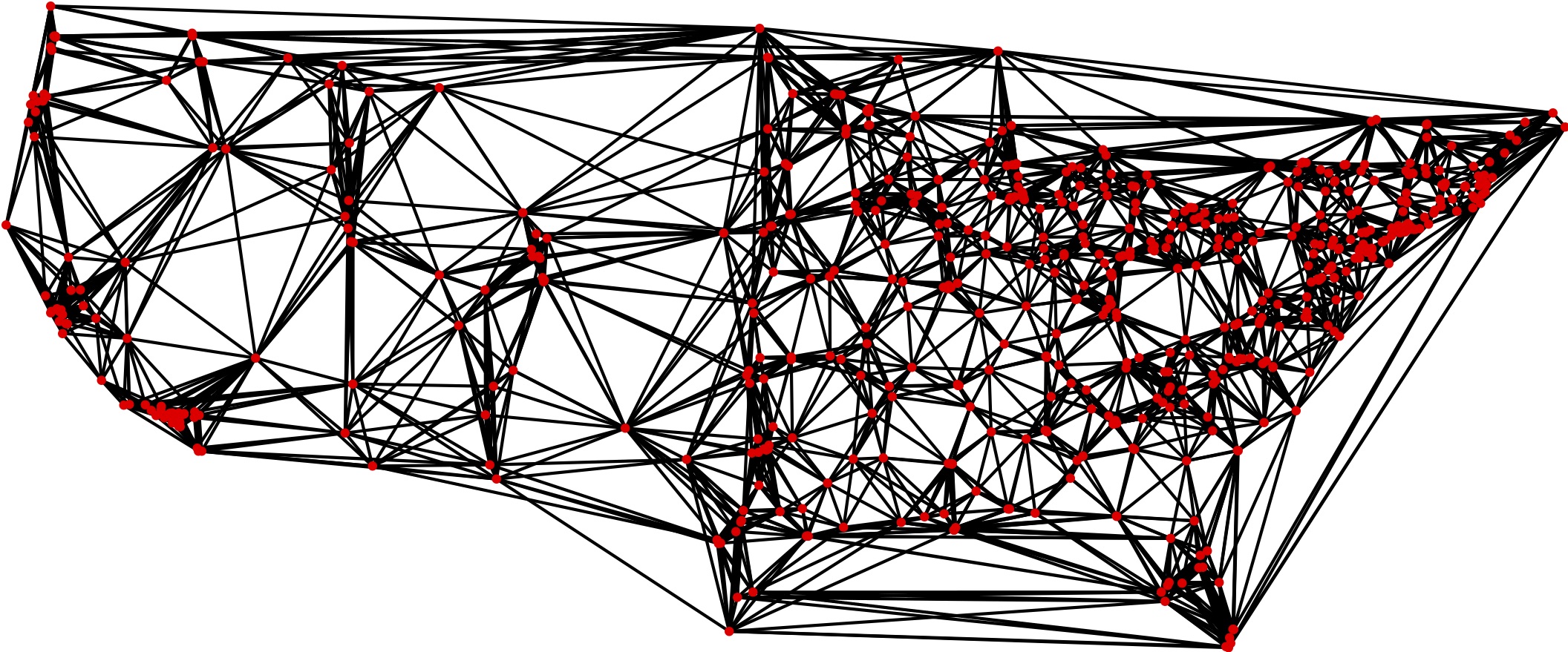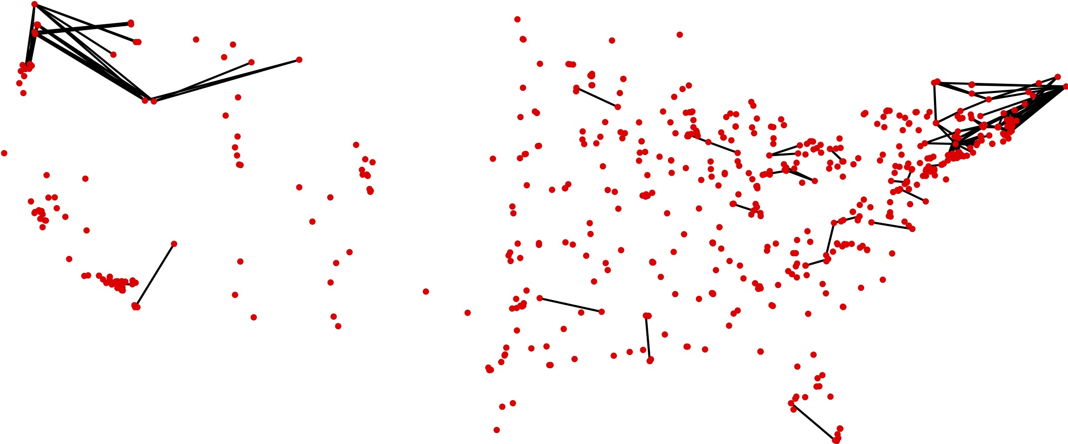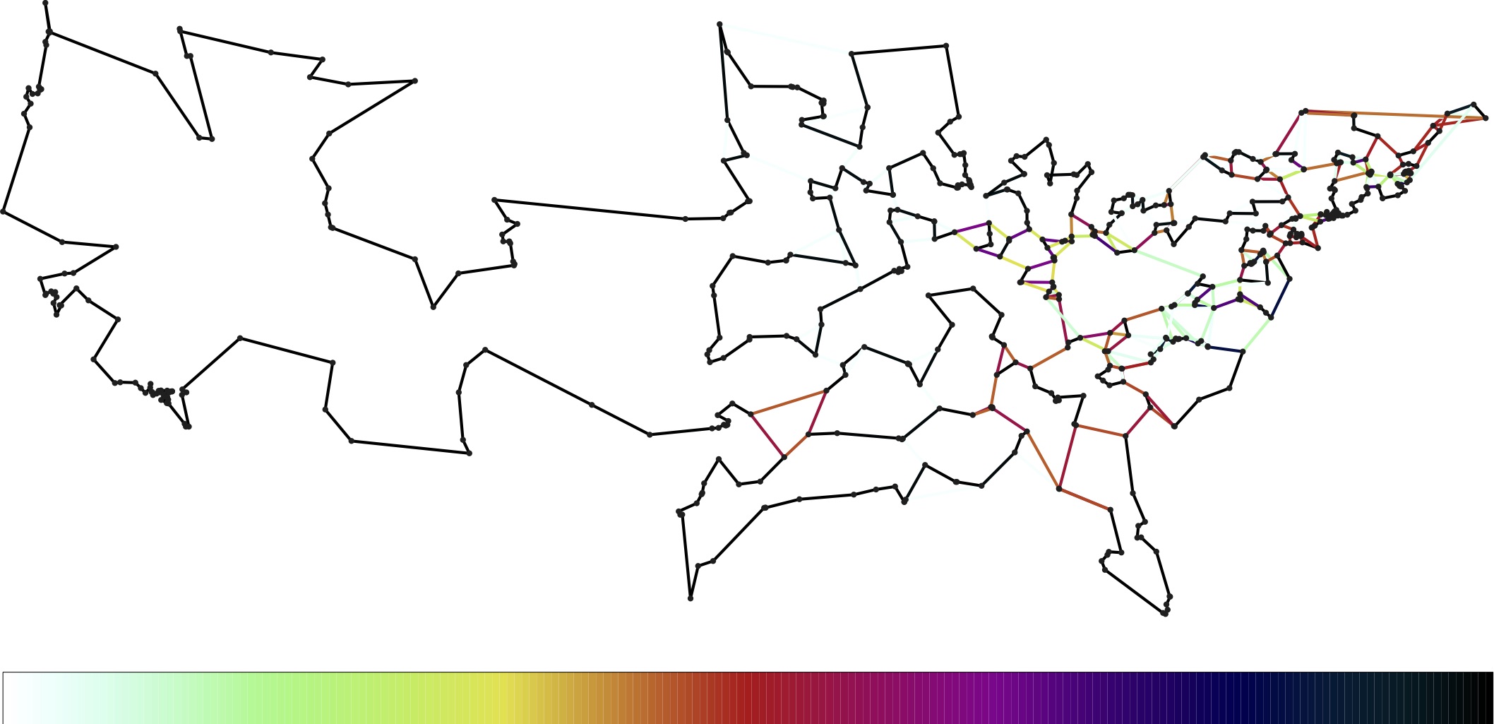 Using some geometry, we made an initial guess at what roads might be useful in the college tour, combining a Delaunay triangulation of the point set, the 10 shortest lines from each point, the 2 shortest lines in each of the four quadrants at each point, and the union of 10 near-optimal tours (for the geometric TSP, not the road TSP). Putting these sets together gives the collection of 4,939 campus-to-campus road trips that we display in the graph below.