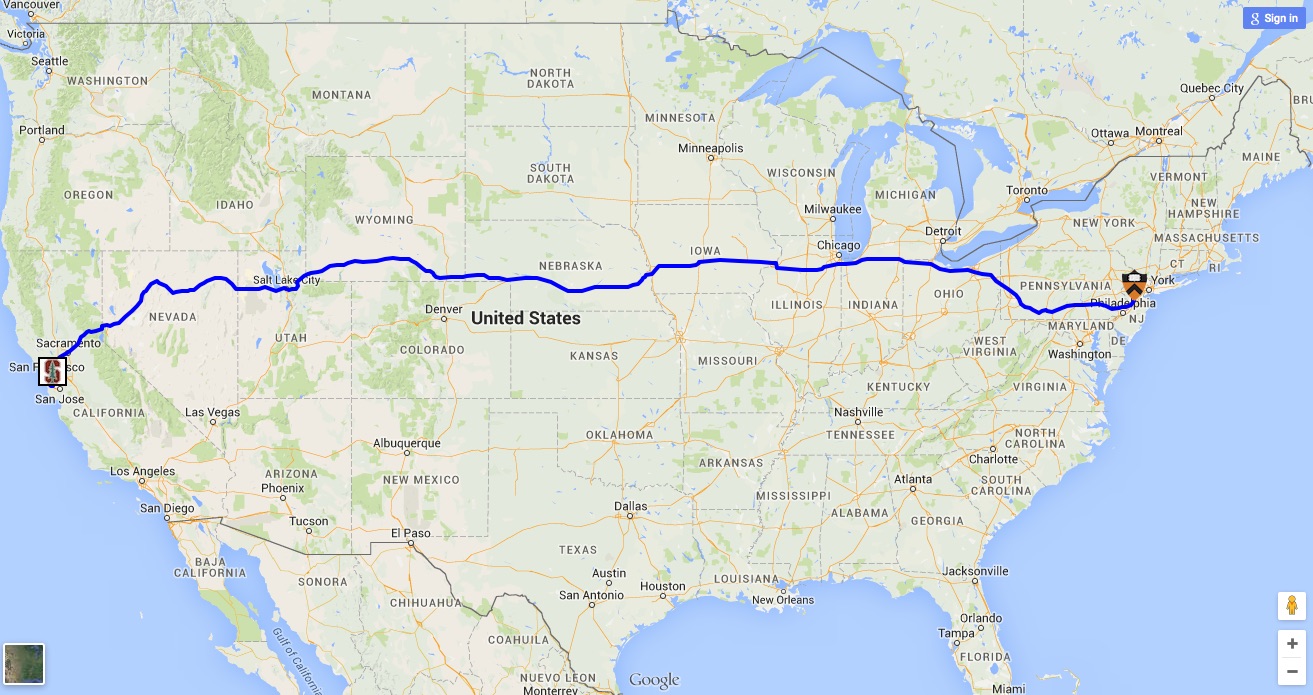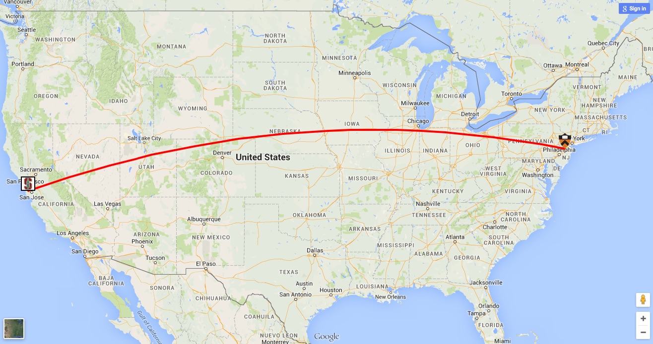 Getting from Princeton to Stanford clocks in at 2,940 miles with Google Maps' road directions. But in a tour through all 647 colleges, we won't likely need to know this route: there are many other campuses between the coasts that we would visit along the way. Indeed, in our computations we can can likely make due with an under-estimate of the Princeton-to-Stanford travel distance, computing the length of a great circle arc on a ball of about the radius of the Earth.