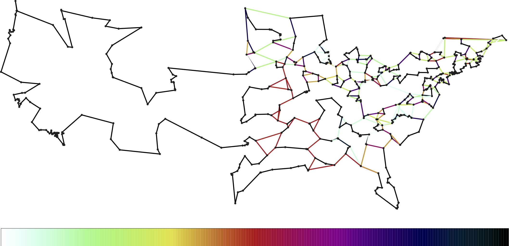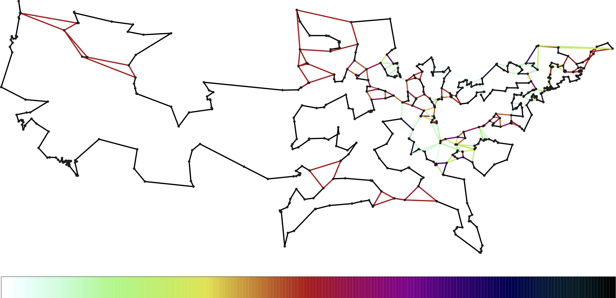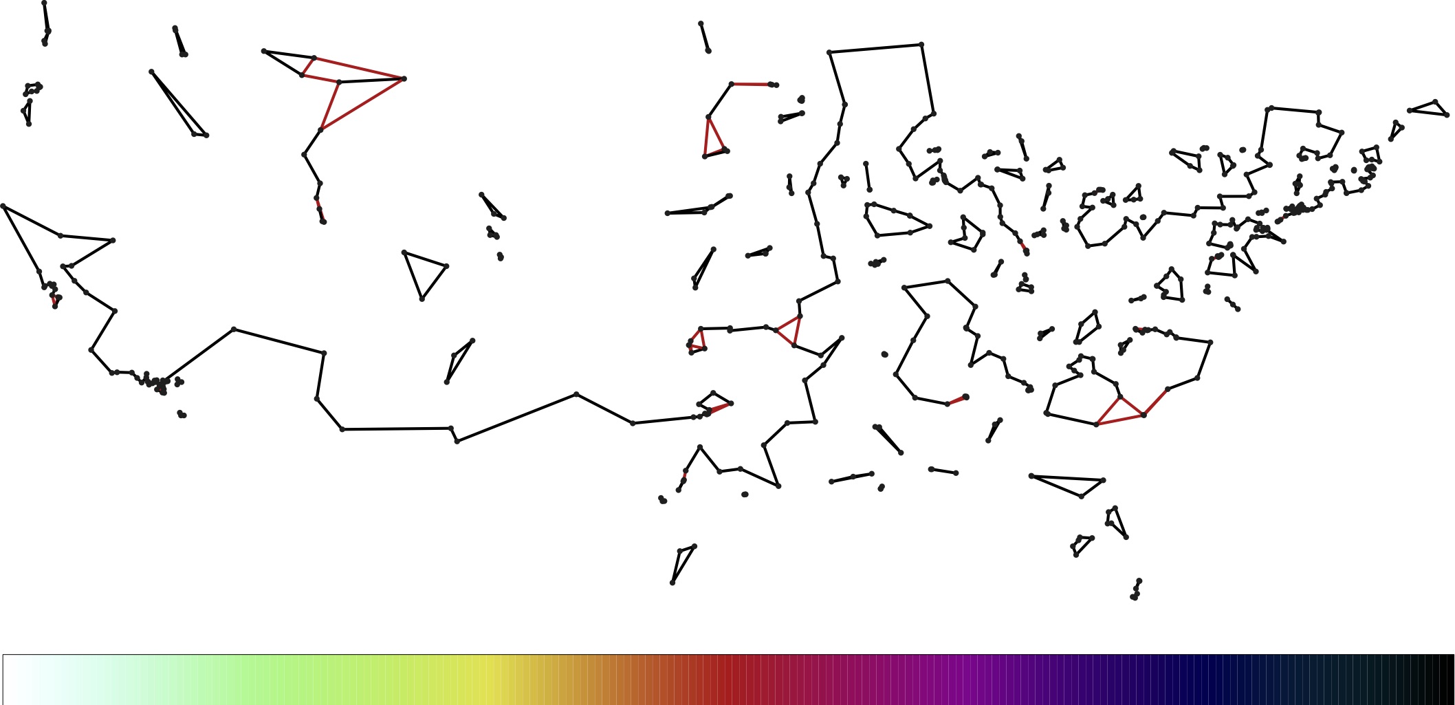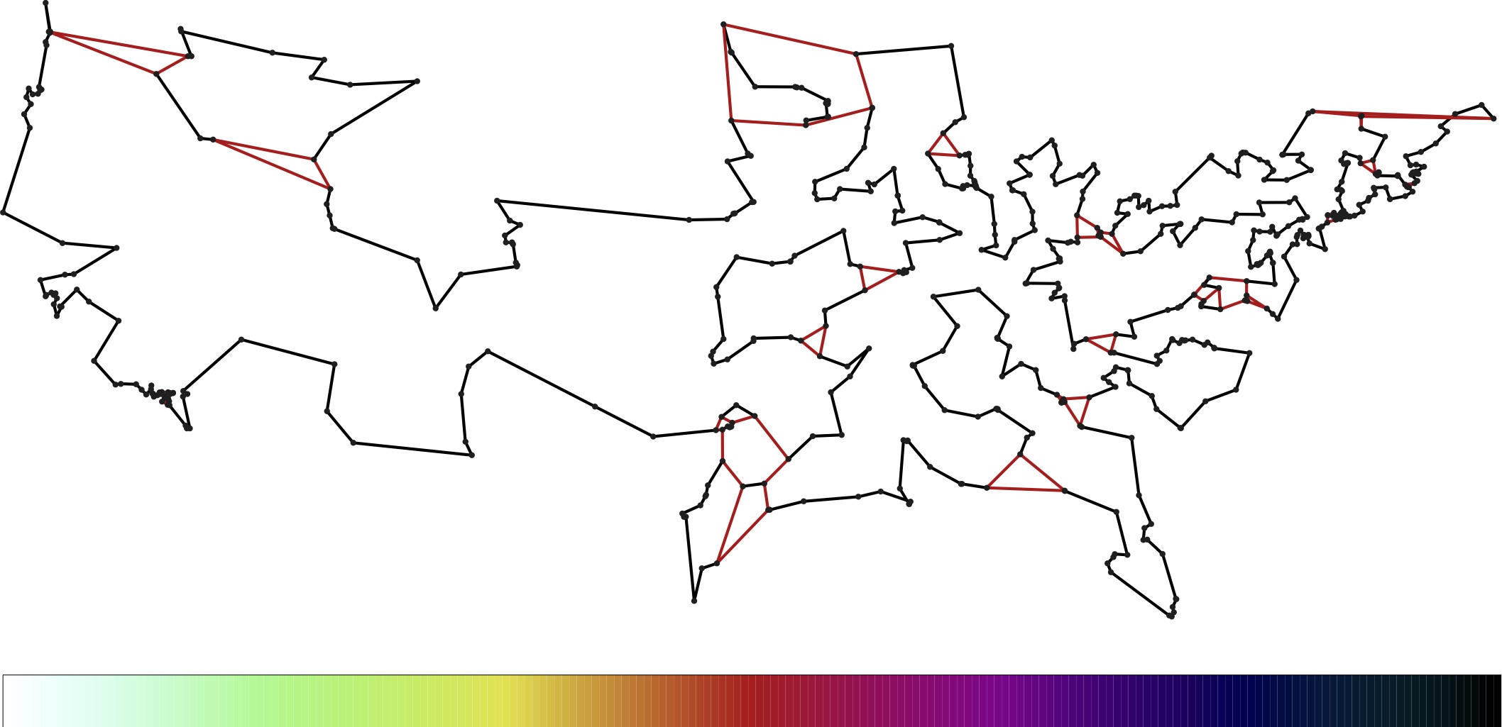 In the set of images below, you can see how the LP solution evolves as we add more and more rules to the model. In the first image, the only rule we used is the one stating that we must choose exactly two roads meeting each location. In LP terms, this means the fractions assigned to the roads meeting the locations must sum to two. To visualize the fractions, we colored roads red if they are set to 1/2, colored them black if they are set to 1, and colored them with values along the indicated scale for any inbetween fractions.