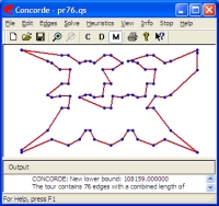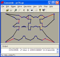The Concorde graphical user interface can be used to apply the Concorde TSP Solver to a specified set of cities. The Concorde solver uses the cutting-plane method, iteratively solving linear programming relaxations of the TSP. The interface shows the solver's progress at the end of each major iteration of cutting planes by coloring the edges according to their current LP values. Once the optimal tour is found it is shown by adding red edges to the display.