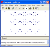 The Concorde interface can read and write graphs from and to files in various formats. (Note: Input graphs must have greater than 10 nodes.) Users may add, delete, and move a graph's vertices interactively. The interface consists of two display panes. One is used to show the graph, the other to print textual information about the graph, the algorithm's progress and results.