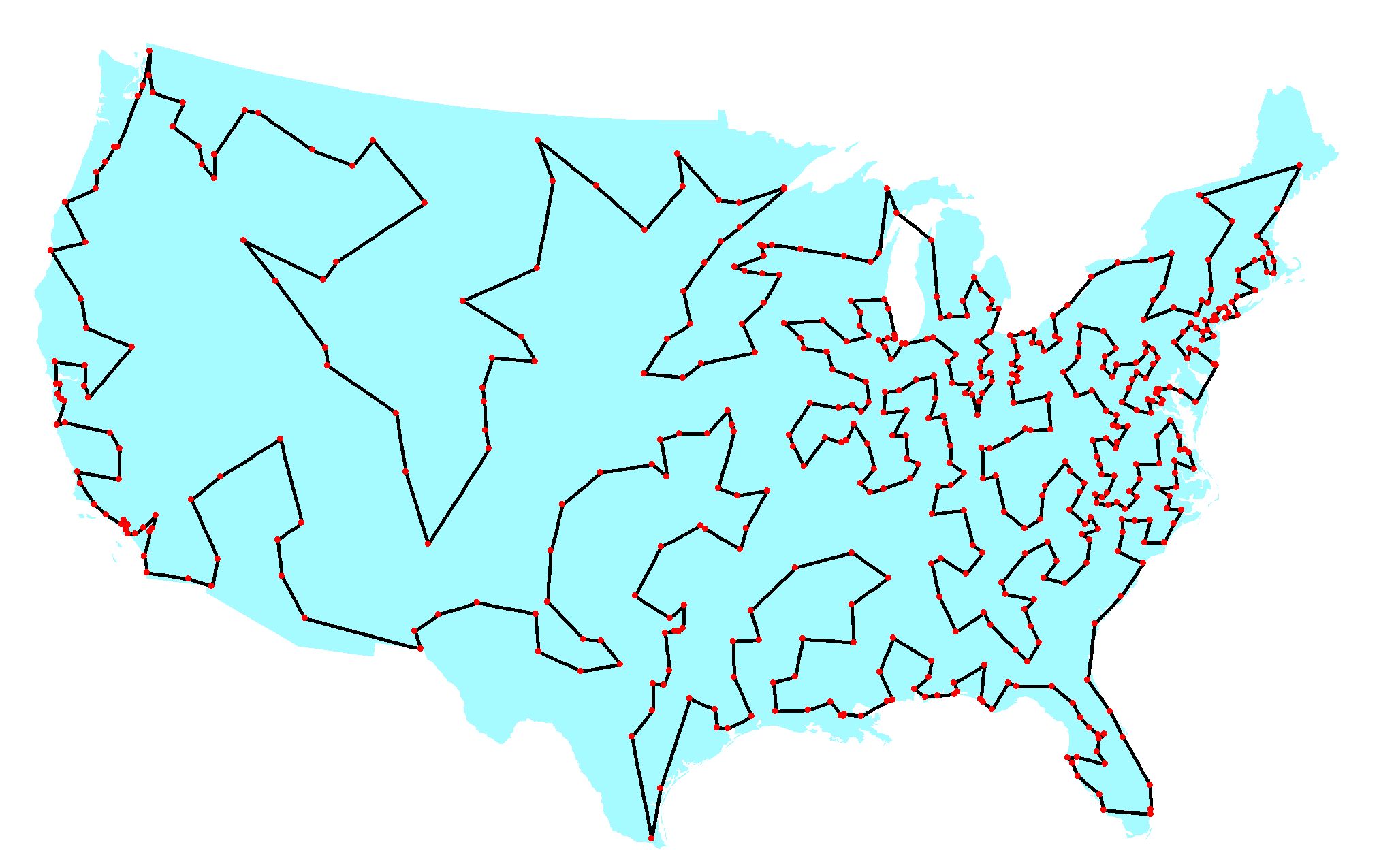 A much larger 48-states instance was solved by Manfred Padberg and Giovanni Rinaldi in 1987, making an optimal tour through 532 cities. This was a world-record solution at the time. The abstract to their research paper can be found here.