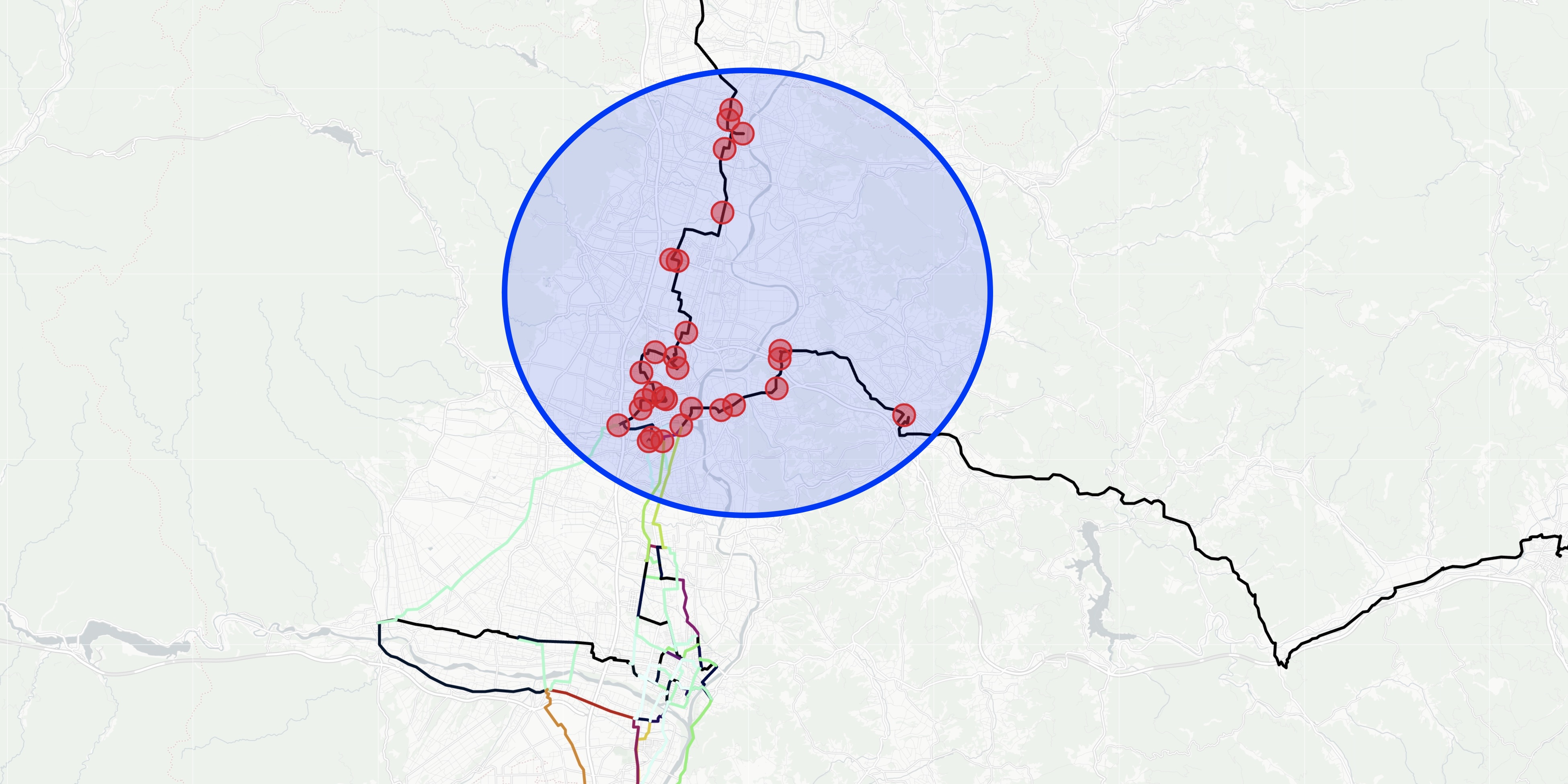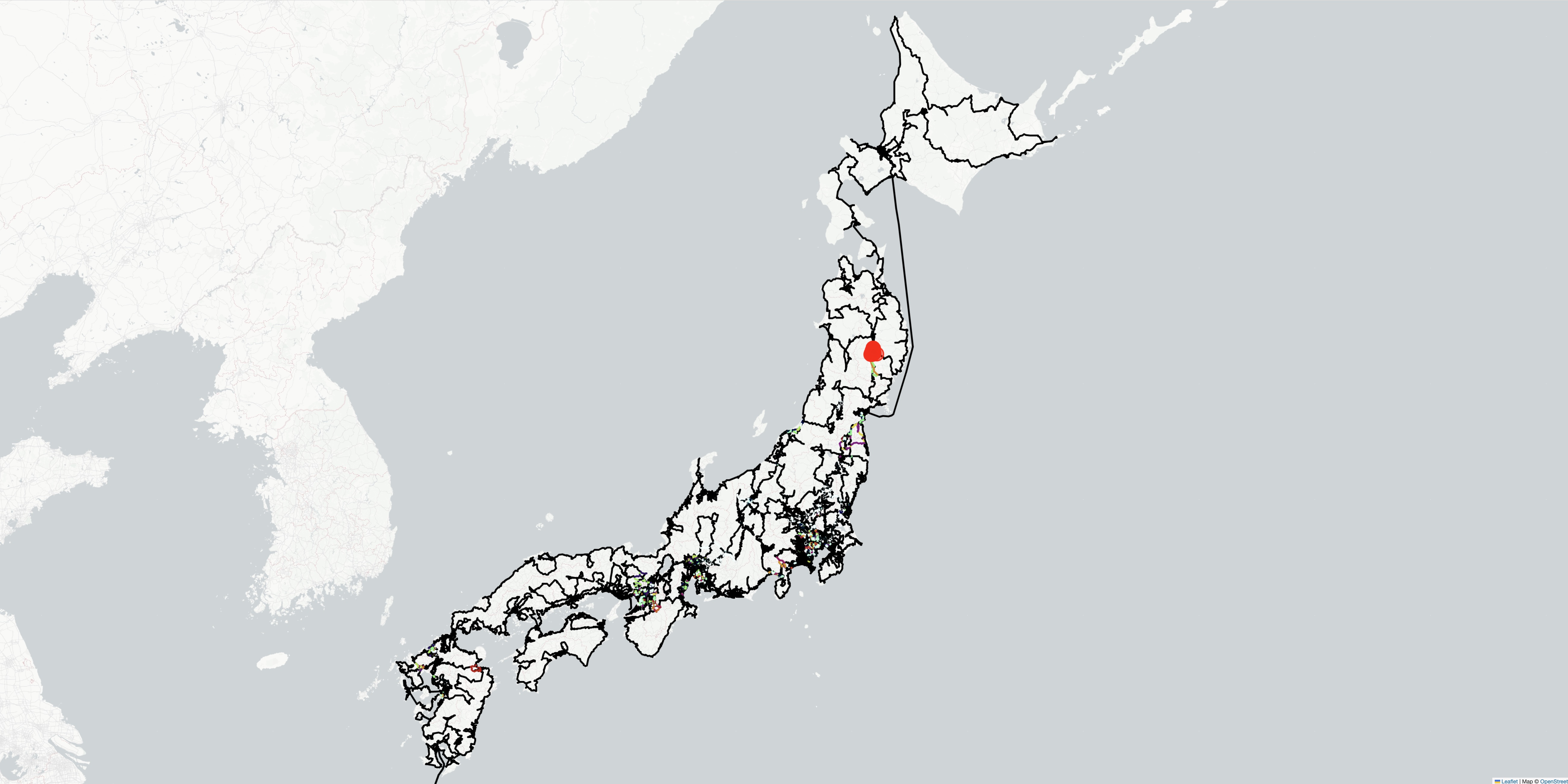 For this LP model, Concorde selected to branch in the region highlighted in red in the full-Japan image given below. This region of the LP solution is expanded in the second image, where a set of stops is indicated by the blue disk.