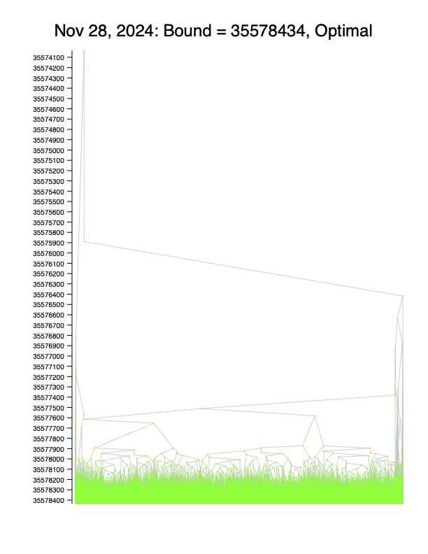 After initial checks of the OSRM distance table, I sent the konbini40426 TSPLIB file to Keld Helsgaun, the creator of the LKH code and all-around tour-finding expert. Sixteen hours later, Keld wrote "LKH+MERGE found a Konbini tour of length 35578434." After another week, Keld found two more tours of this same length. Based on past experience with LKH results on large map instances, we were, at this point, confident that 35578434 must be very close to the shortest-possible value for konbini40426. It took another 8 weeks before we eventually proved that it is not only close, it is in fact the optimum.