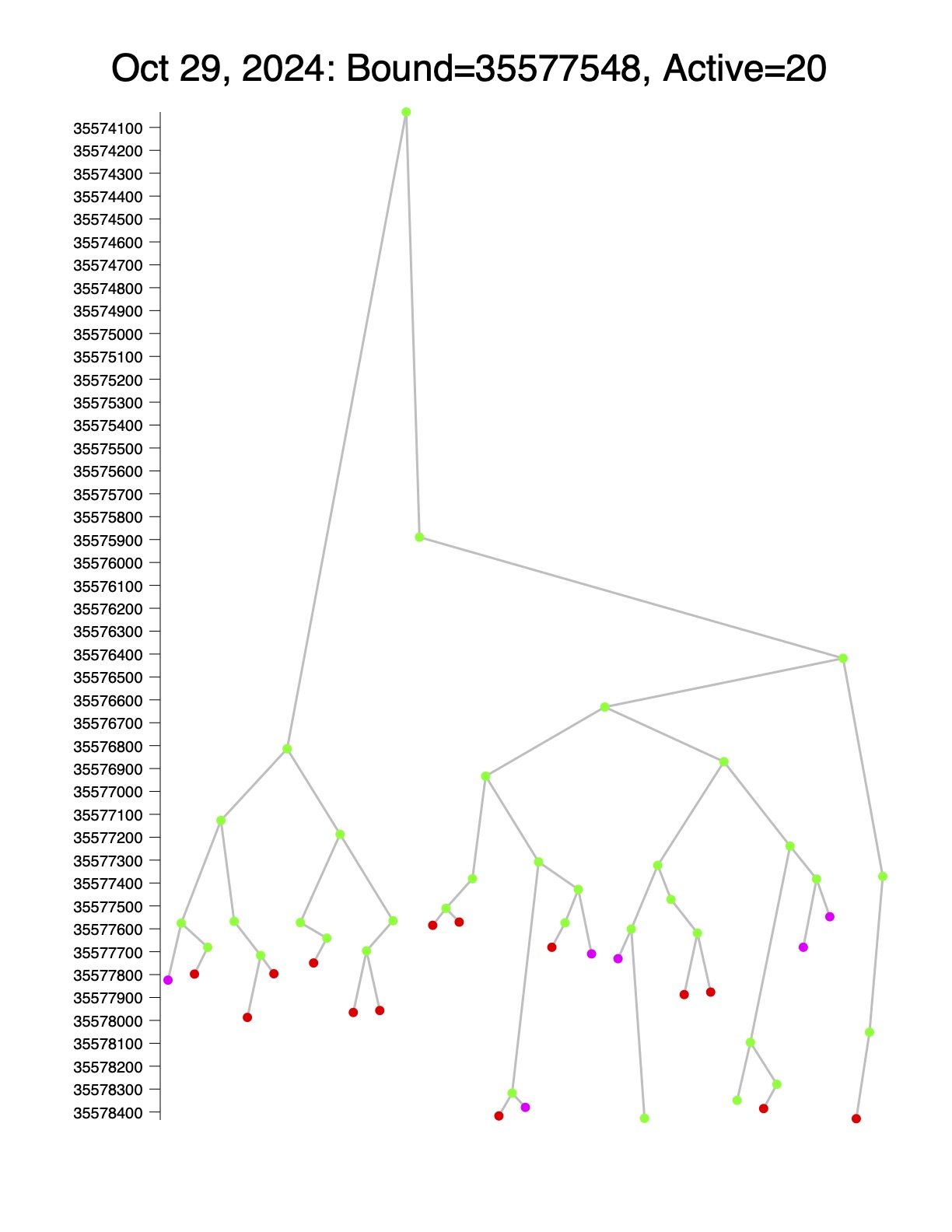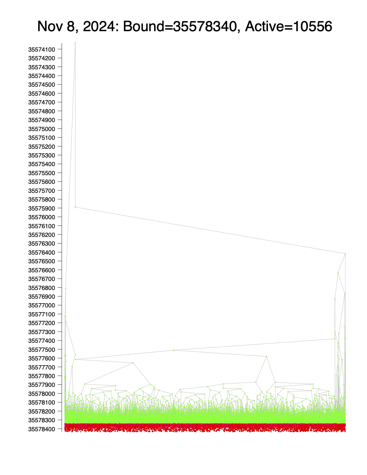At the top of each image, we display the lower bound established by the search and the number of active subproblems. Notice the red/magenta line of active nodes slowly moving down the images, as the search progresses to better and better lower bounds.