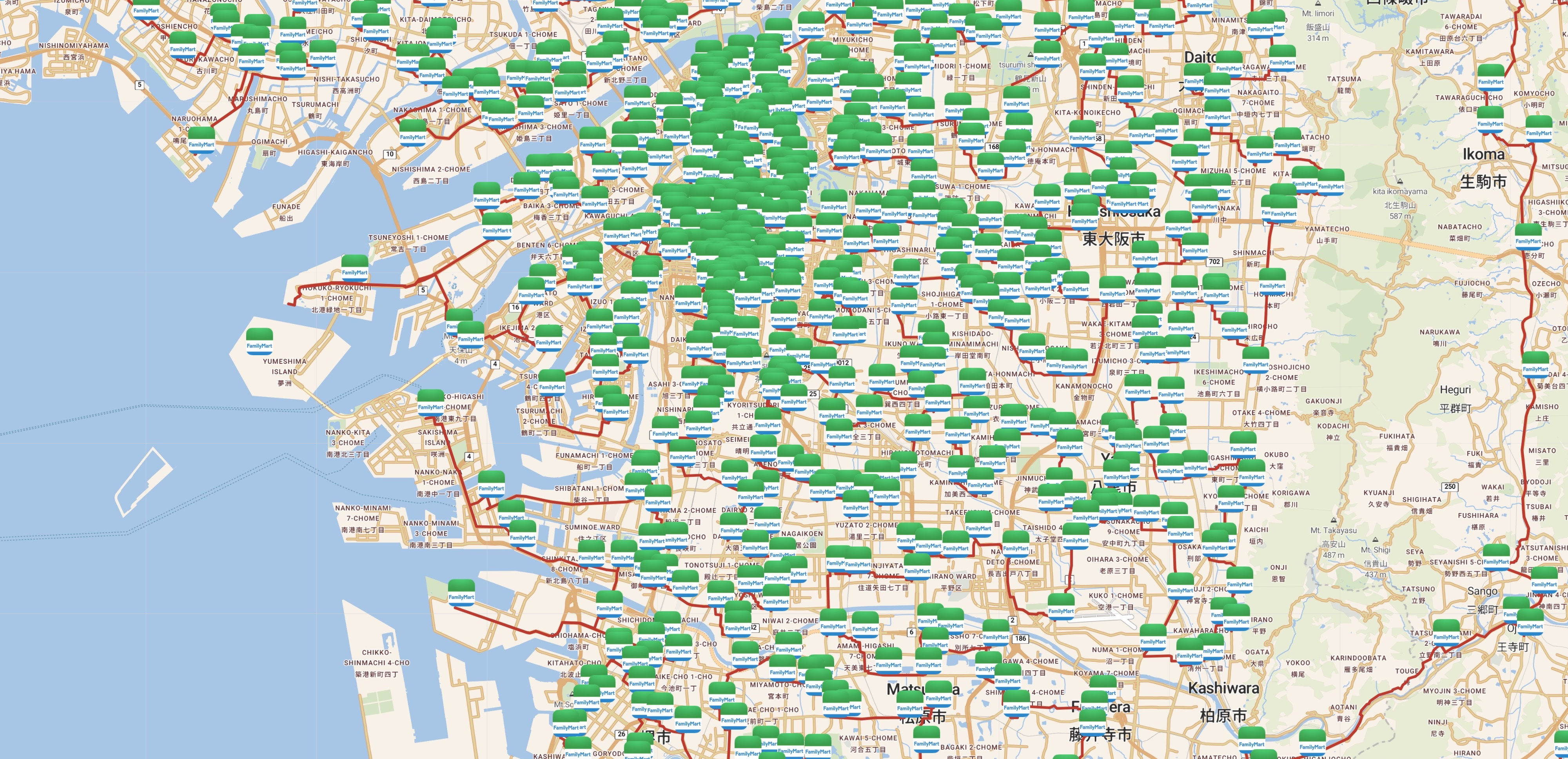 The tours for five of the six individual chains of convenience stores visit all of the stops included in konbini40426. For the Seicomart tour we restricted the tour to Hokaiddo, to avoid a long ferry trip to pick up the small number of shops outside the island. If you are interested in seeing the optimal routes, use the buttons in the blocks below to view interactive maps and high-resolution images.