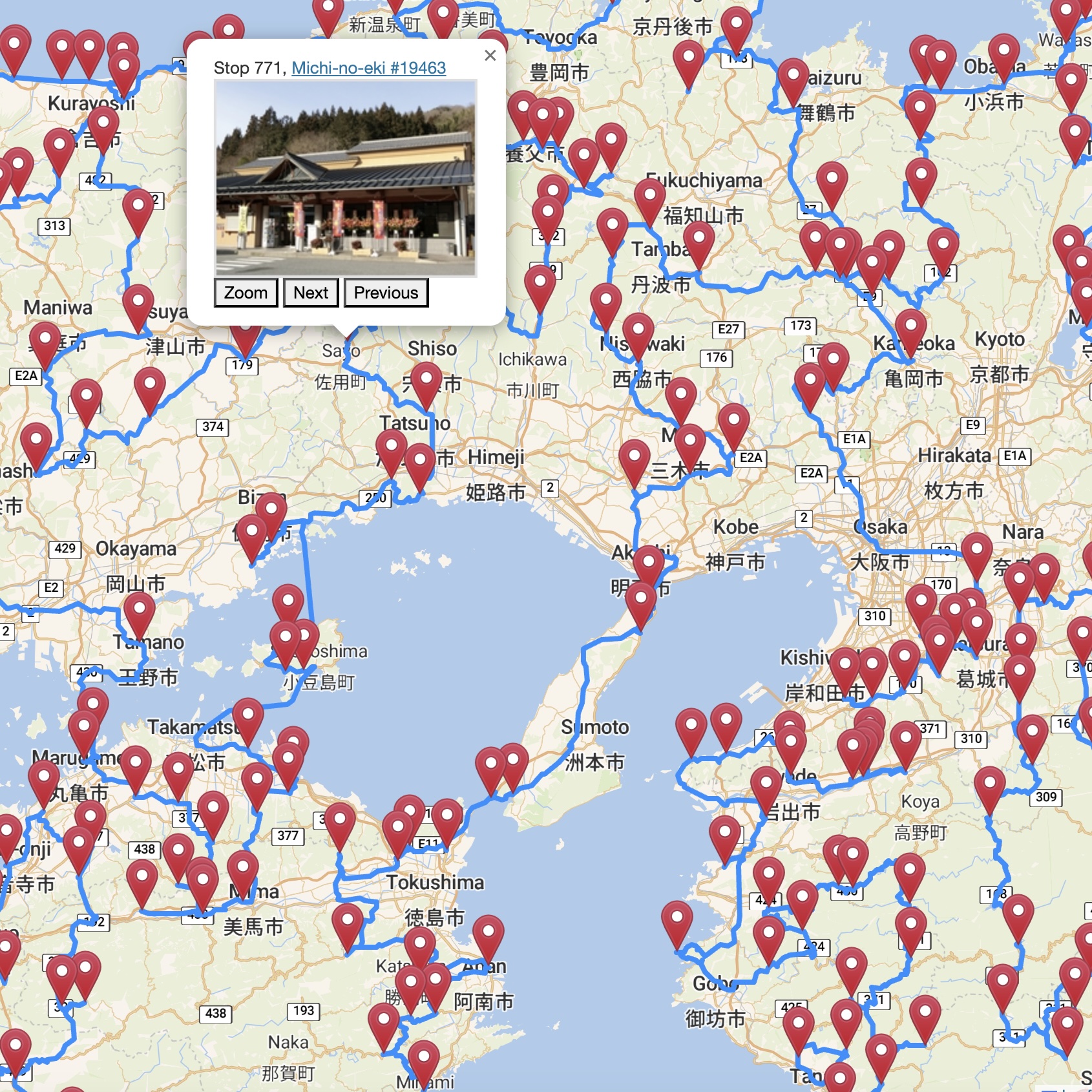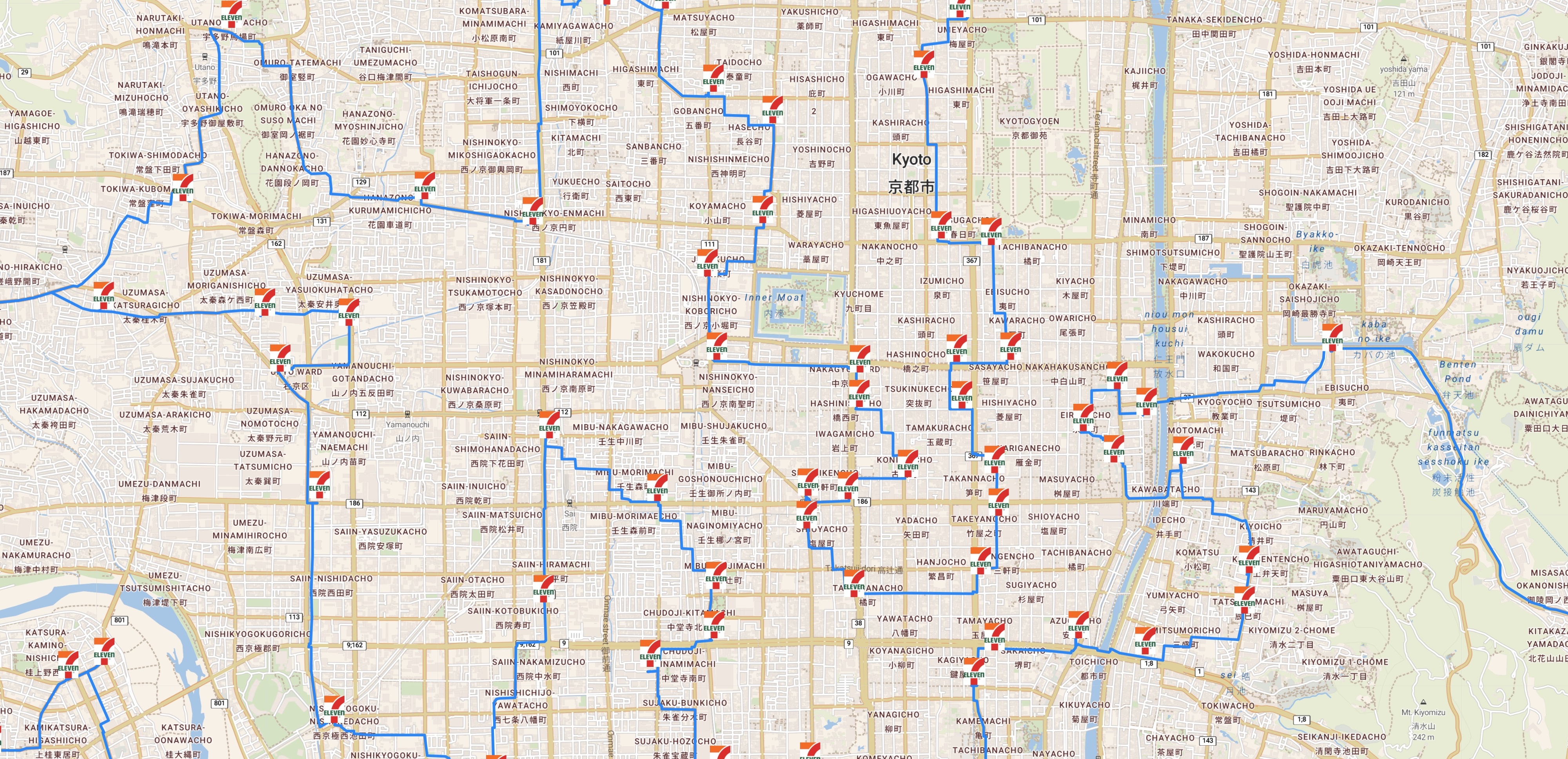 The Map button will bring up an interactive map-drawing of the tour, allowing you to pan and zoom. But note that there may be considerable lag when you navigate the large 7-Eleven, FamilyMart, and Lawson tours. For these you may want to use the Lite button for a simpler map drawing, where stops are indicated by cirles. The Lite maps should load more easily than the full maps.