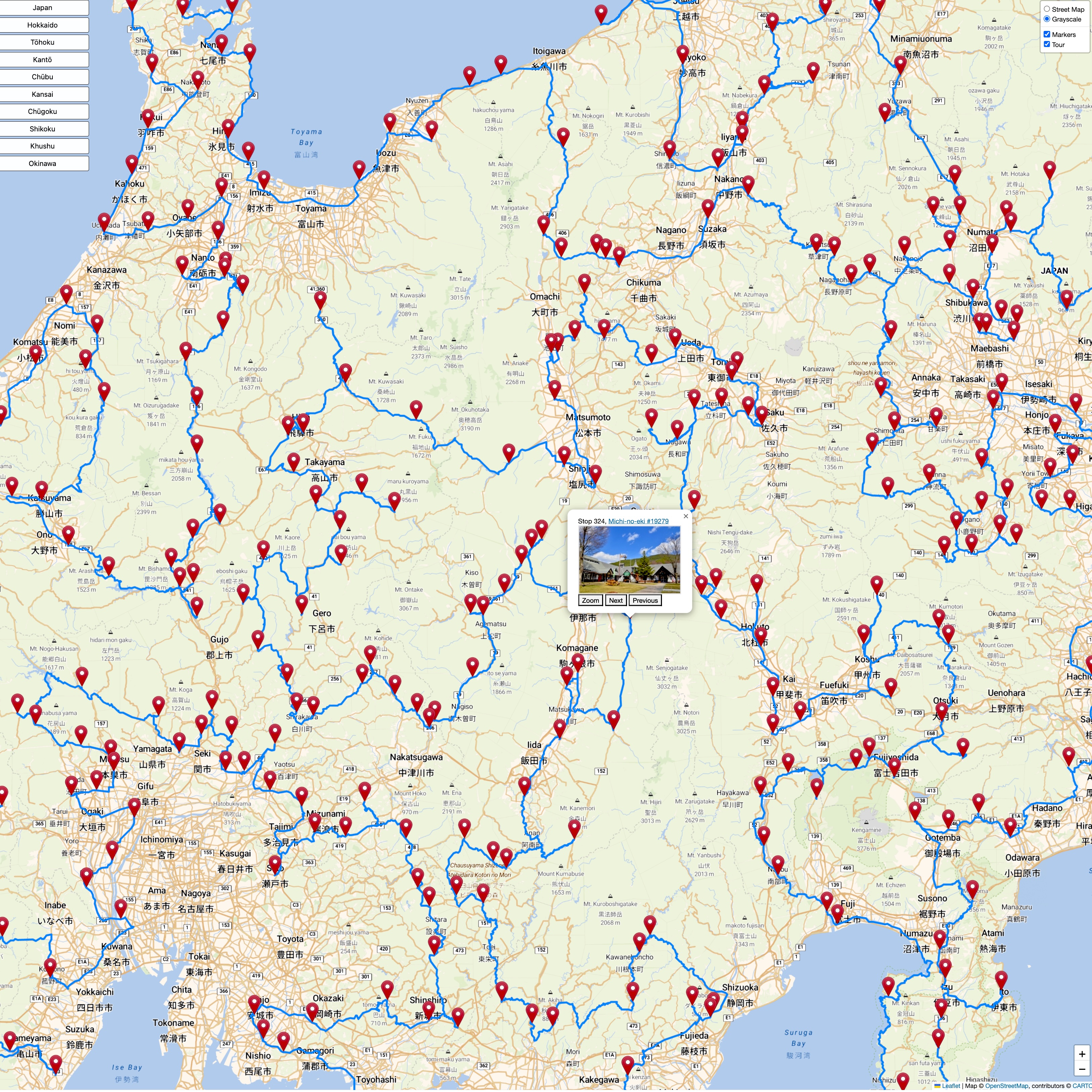In the full-map drawing you will see a menu in the top left-corner with buttons to zoom into regions of Japan. The top right-corner of the map contains a small menu for modifying the drawing, and the bottom right-corner has buttons for zooming in or out. Clicking on a location marker will display a menu to allow you to zoom into the shop location or to pan to the next stop in the tour.