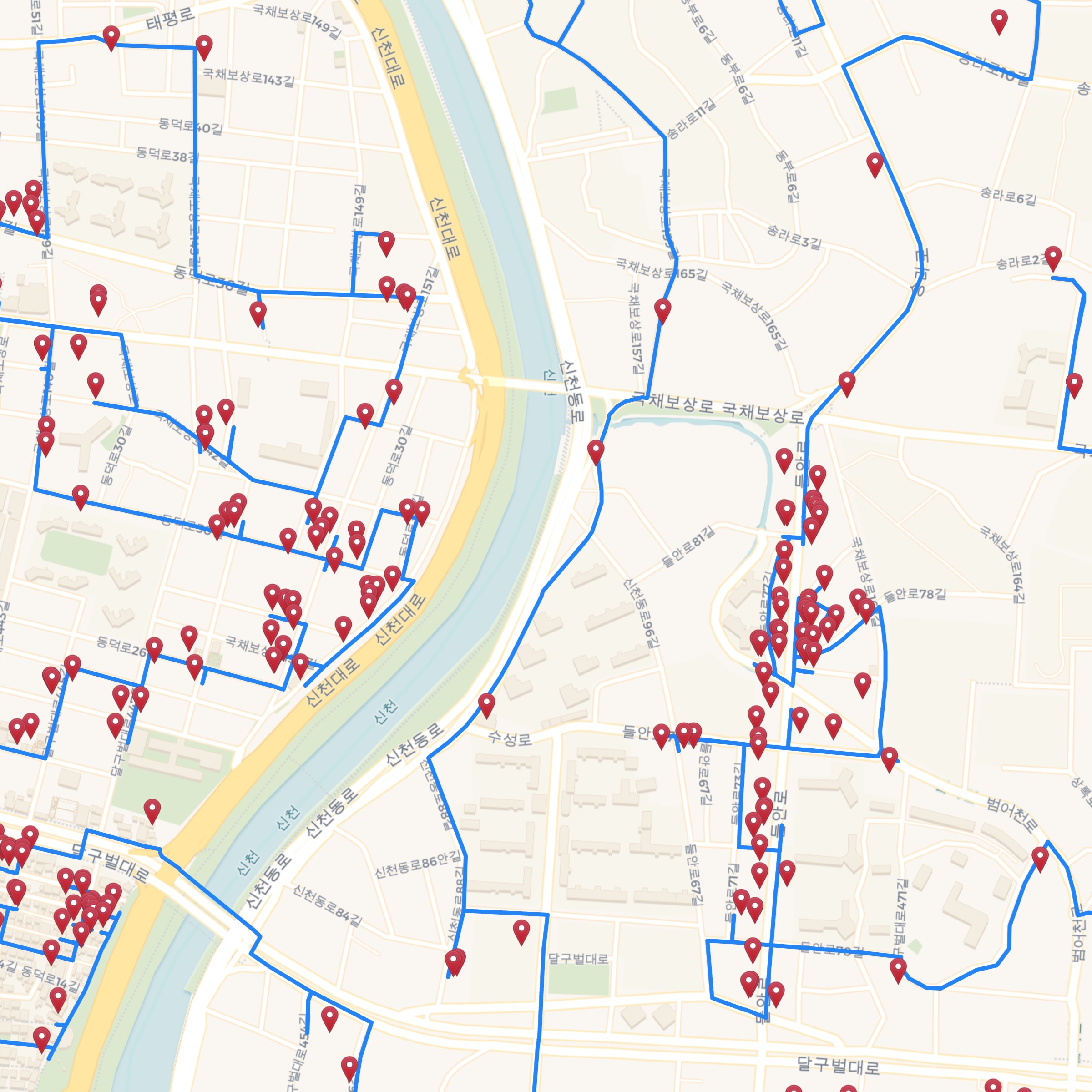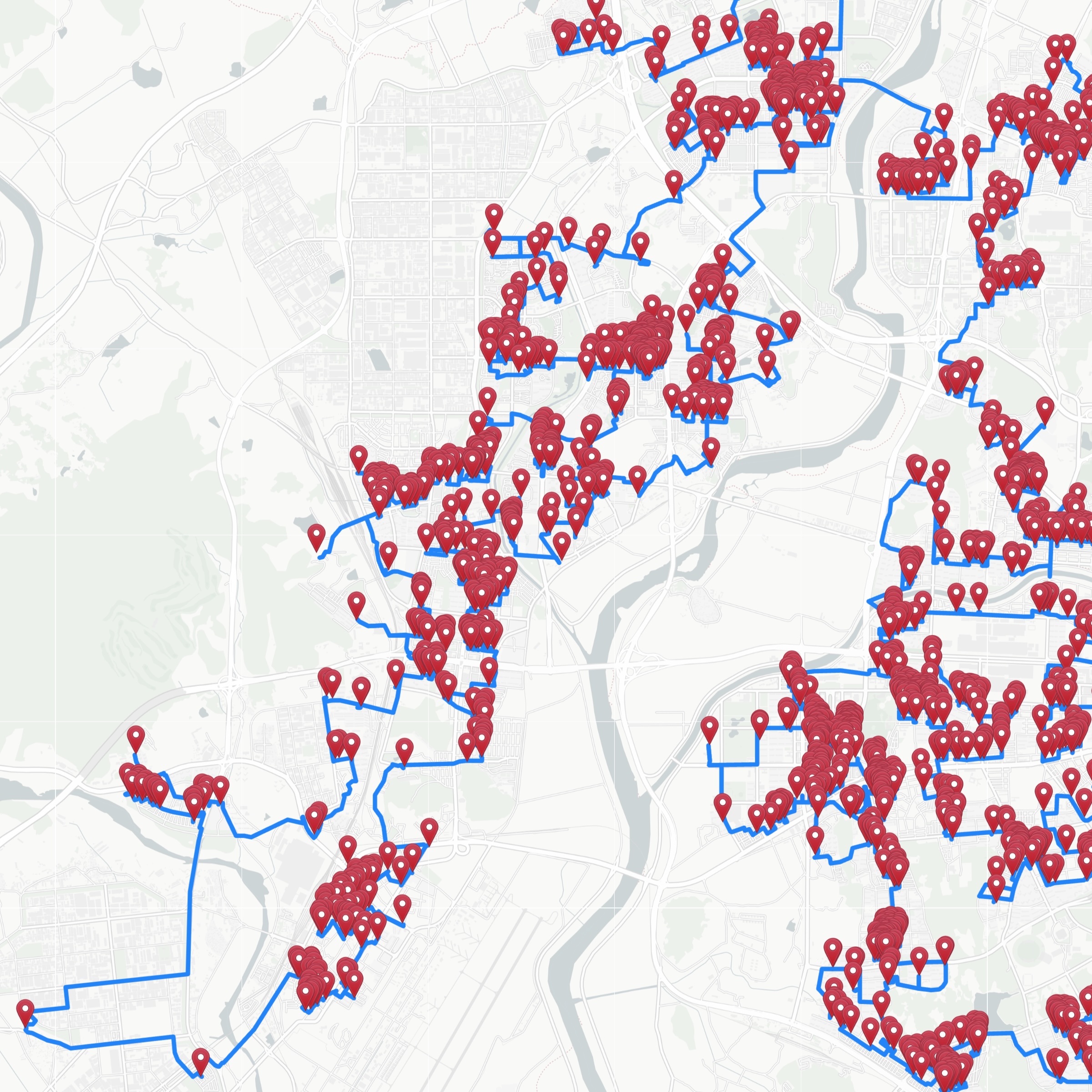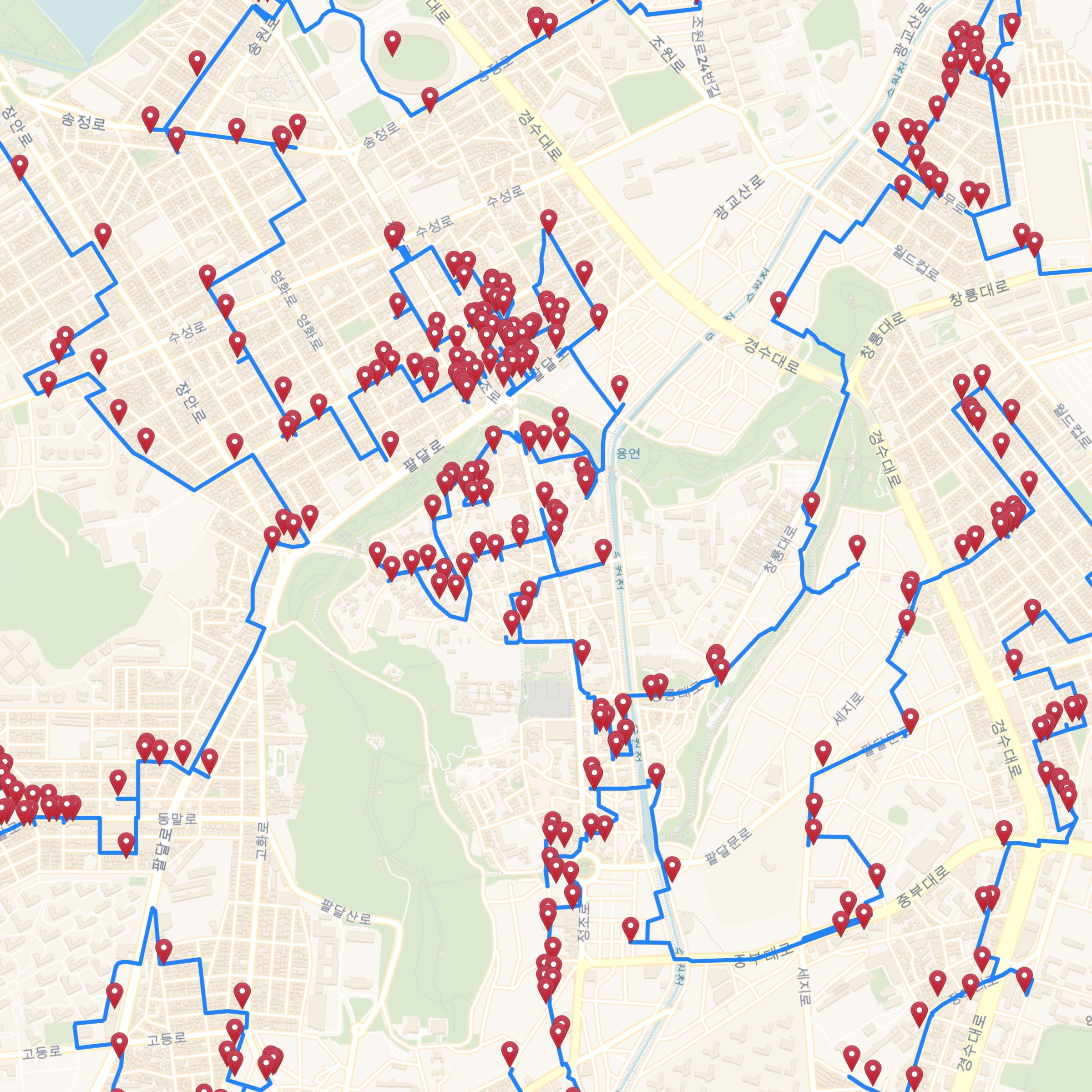 You can get a feeling for the complexity of the optimal tour by examining how it passes along small roads and paths to visit neighborhood bars. To allow this, without the considerable lag time when navigating the full-tour map, we created an interactive map that contains only regions around a number of Korean cities.