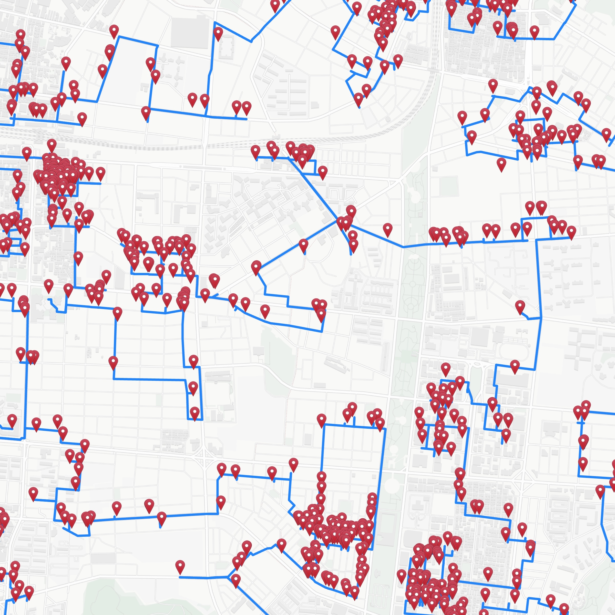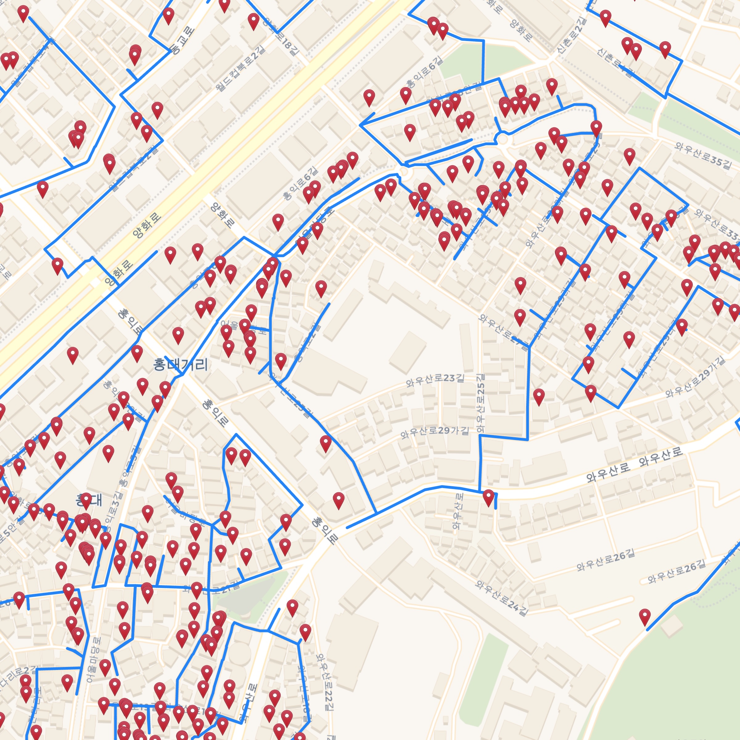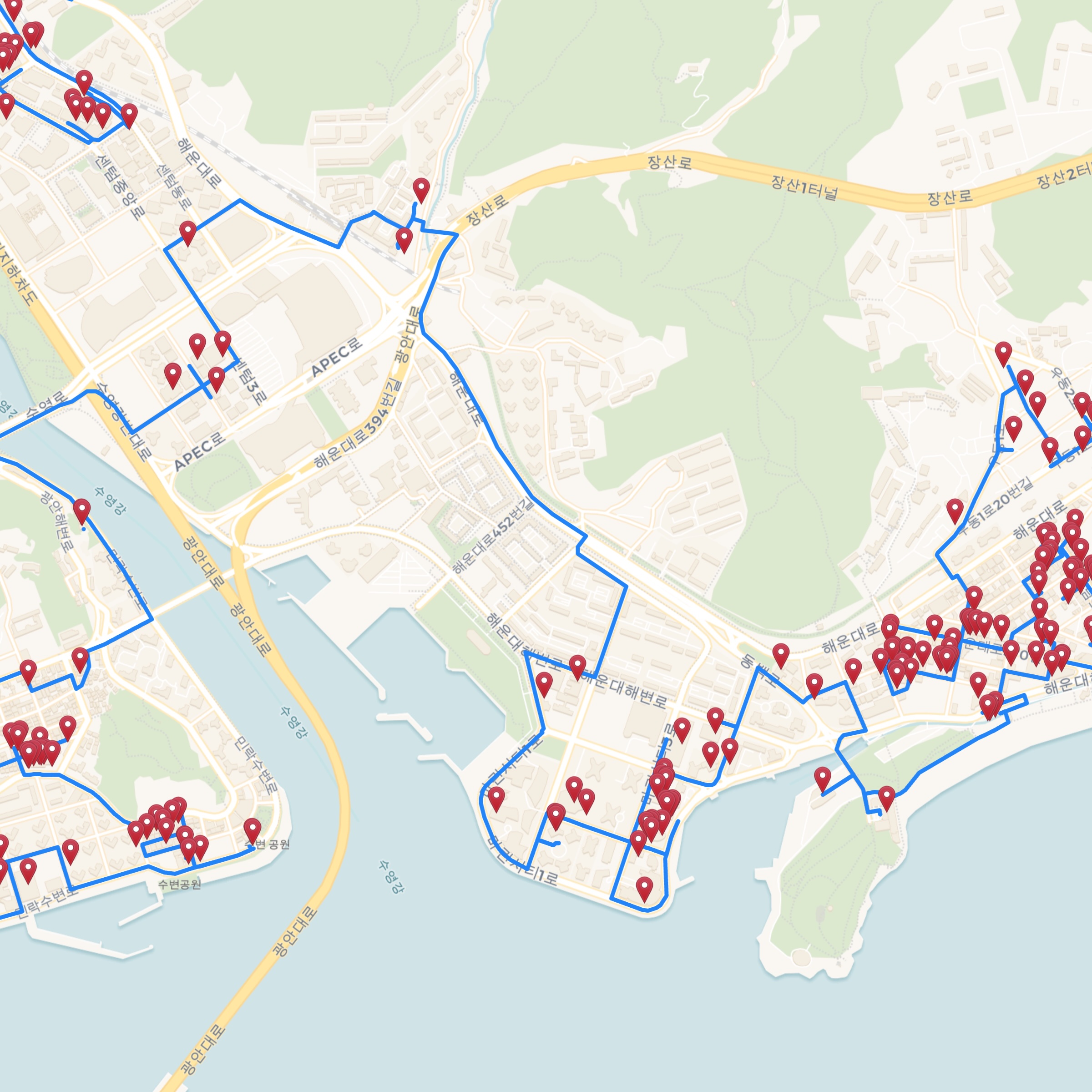 You can get a feeling for the complexity of the optimal tour by examining how it passes along small roads and paths to visit neighborhood bars. To allow this, without the considerable lag time when navigating the full-tour map, we created an interactive map that contains only regions around a number of Korean cities.