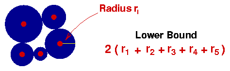 When judging a lower bound, bigger is better.  Unfortunately, for almost any TSP you can think of, the bound 2r will be rather small when compared to the length of any tour through the points. But the answer is simple, we can draw a seperate disk for each of our cities, as long as the disks do not overlap.  In this we way we get twice the sum of the radii of the disks as a lower bound for the TSP.