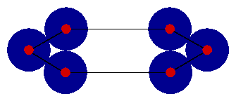 A more pressing problem however is that the quality of the bound we get from the best collection of disks is often not all that great.  The nice packing of disks in the 5-city figure given above is a bit misleading -- usually the bound we get from the best packing is significantly below the length of the best tour.  An example of what can go wrong is given in the figure below.