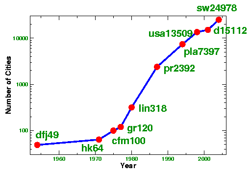 An easily recognized sign of progress on test instances is the increasing size of the largest TSPs that have been solved over the years, as we show in the plot at the top of this page.  This record of progress began with Dantzig, Fulkerson, and Johnson's classic paper in 1954 where they solve a 49-city problem consisting of one city from each of the 48 states in the U.S.A. (Alaska and Hawaii were not yet states) as well as Washington, D.C.  A full list of the solution milestones can be found in the TSP History pages.