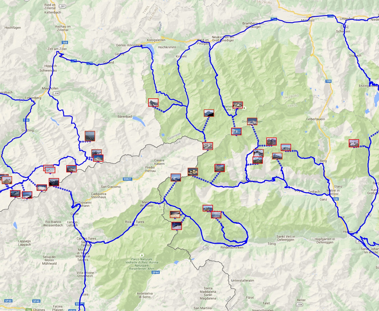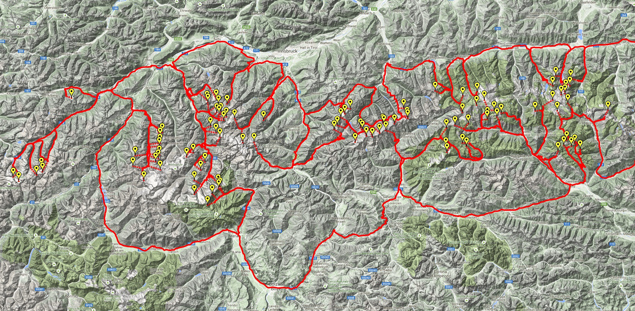 Note: Google Maps leaves it up to hikers to make the selection of the final climb to each of the moutain peaks. I've indicated these portions of the tour with dotted lines.