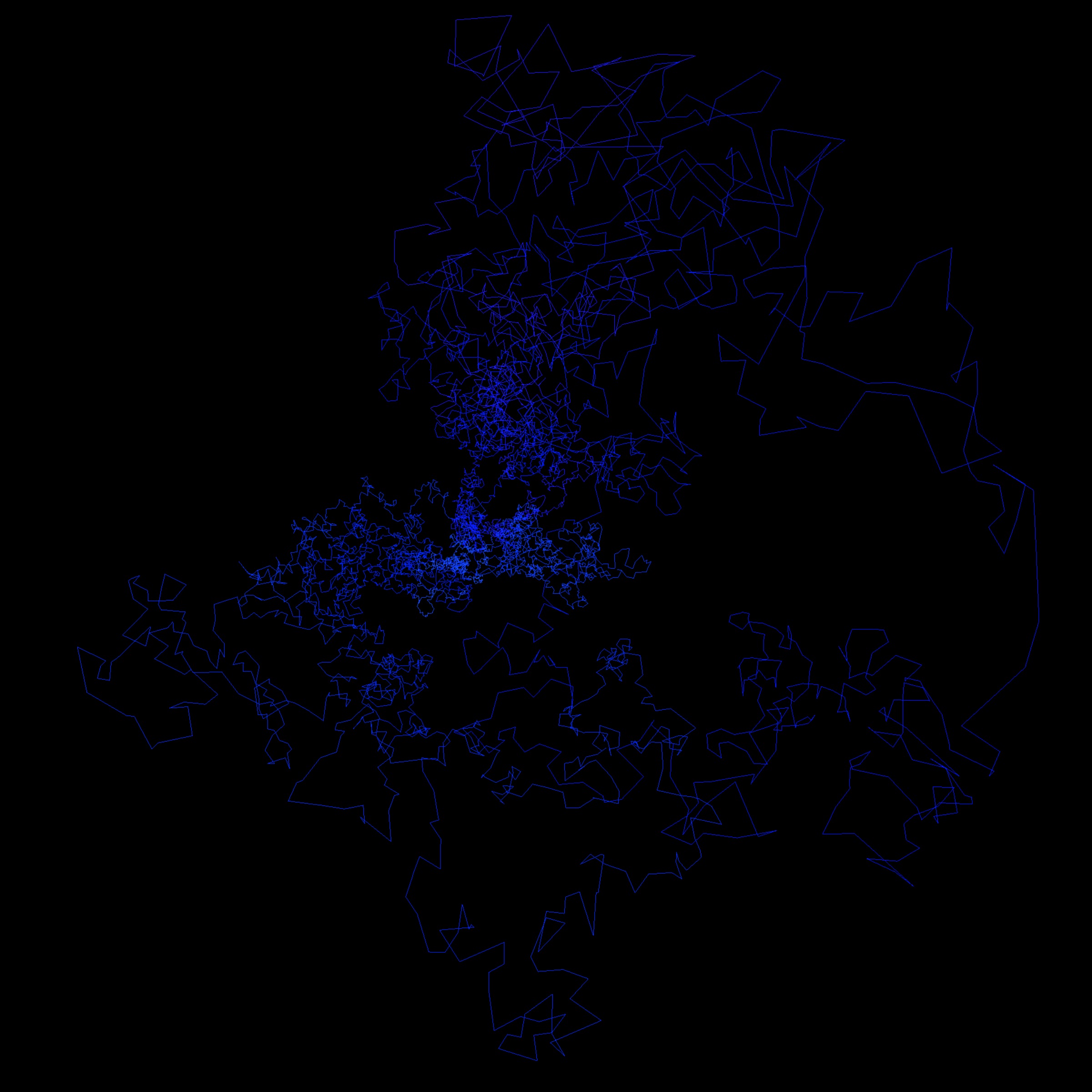 The Tour -- Zoom, pan, and rotate the point set to see the 3D structure. Stars are represented by twinkling points, using color to represent each star's position in the tour. The tour is traced by colored lines.