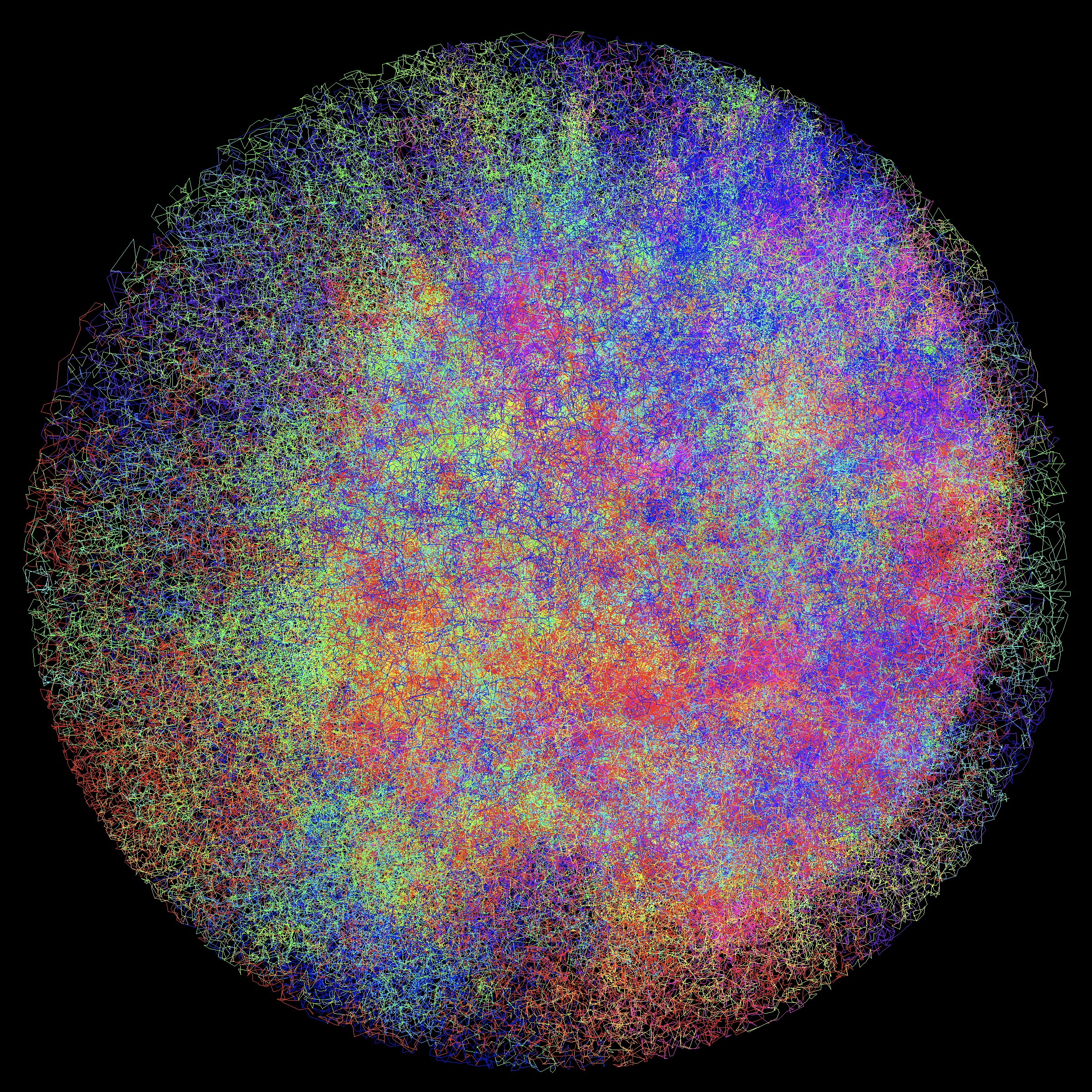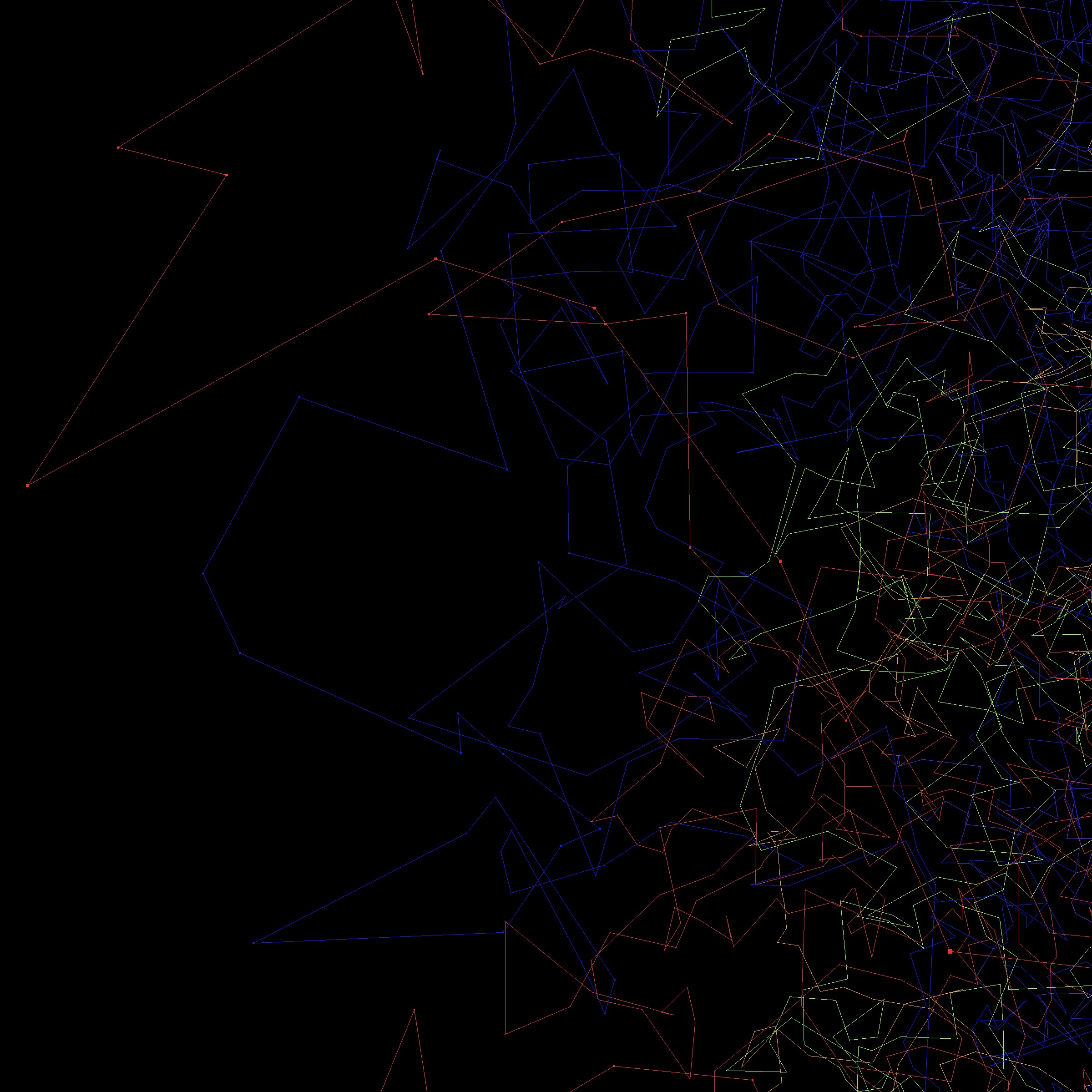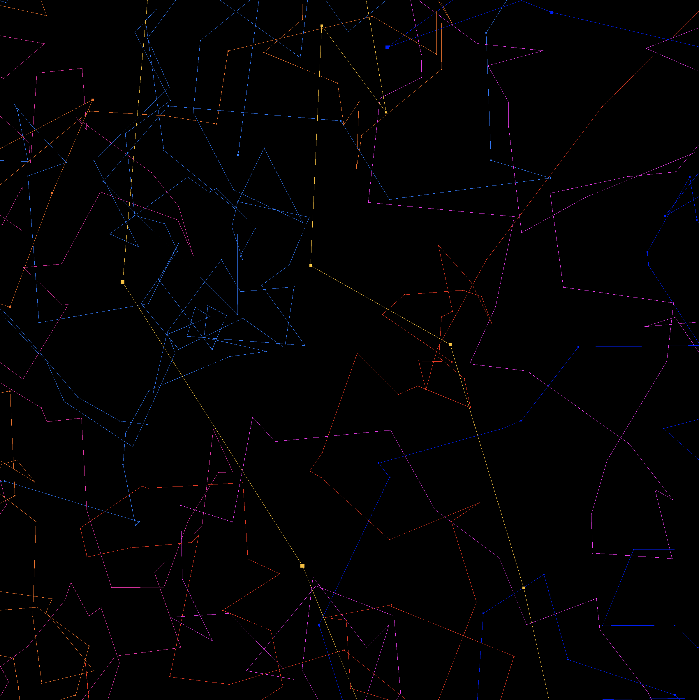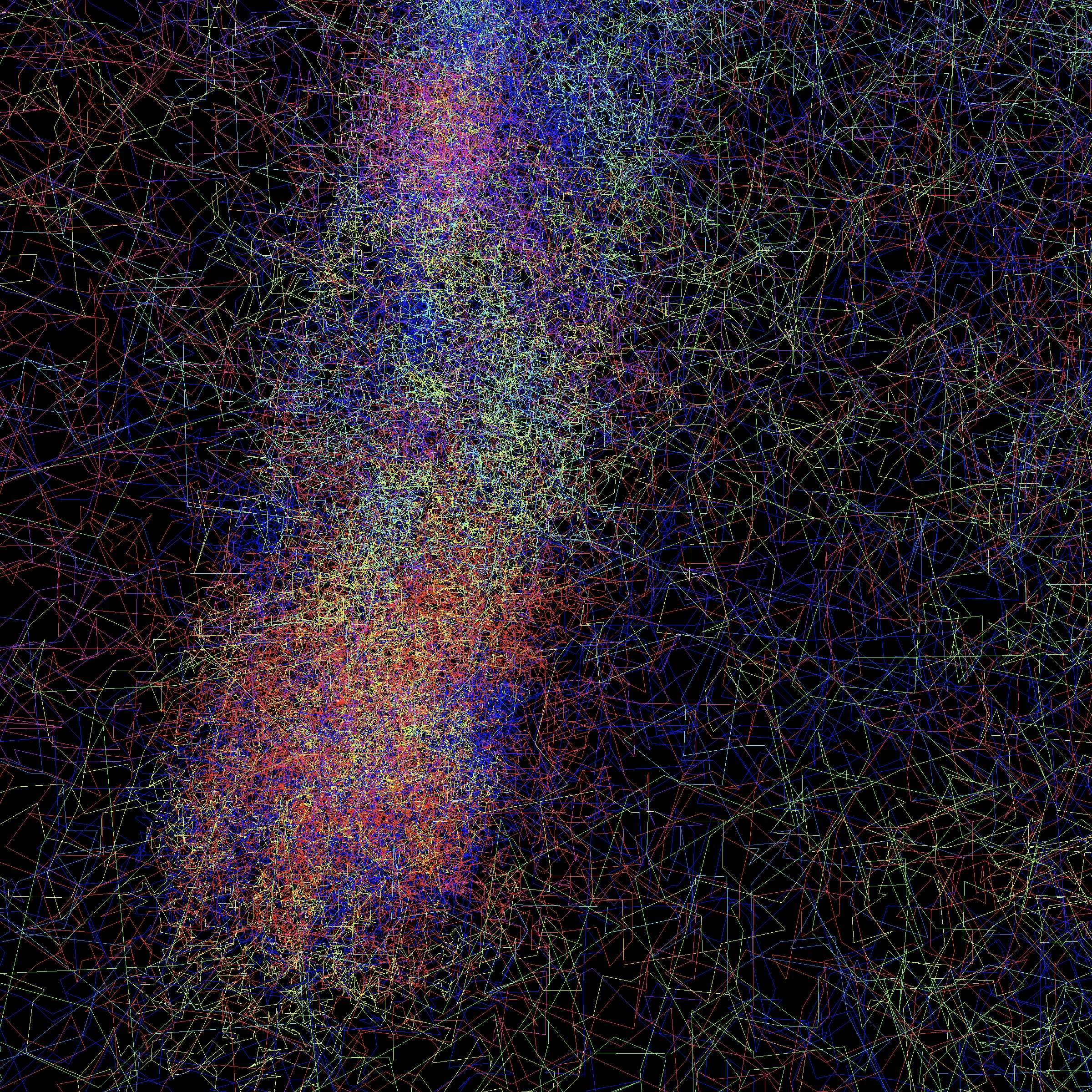 The images below are screen shots from an interactive rendering of the tour, created with the three.js JavaScript 3D library. The points and edges are colored in tour order; the hue of each point/edge represents its position in the tour.