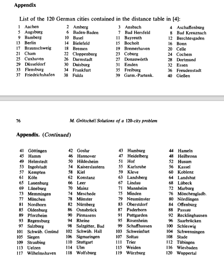 Martin Groetschel, the current President of the Berlin-Brandenburg Academy of Sciences and Humanities, pushed the road-TSP record to 120 cities as part of his PhD work in 1977. Definitely no asterisk here. His challenge problem used the full distance-table in the 1967/68 edition of the Deutscher General Atlas, with point-to-point distances measured in kilometers. Again, a tip of the hat to him for taking all of the available data.