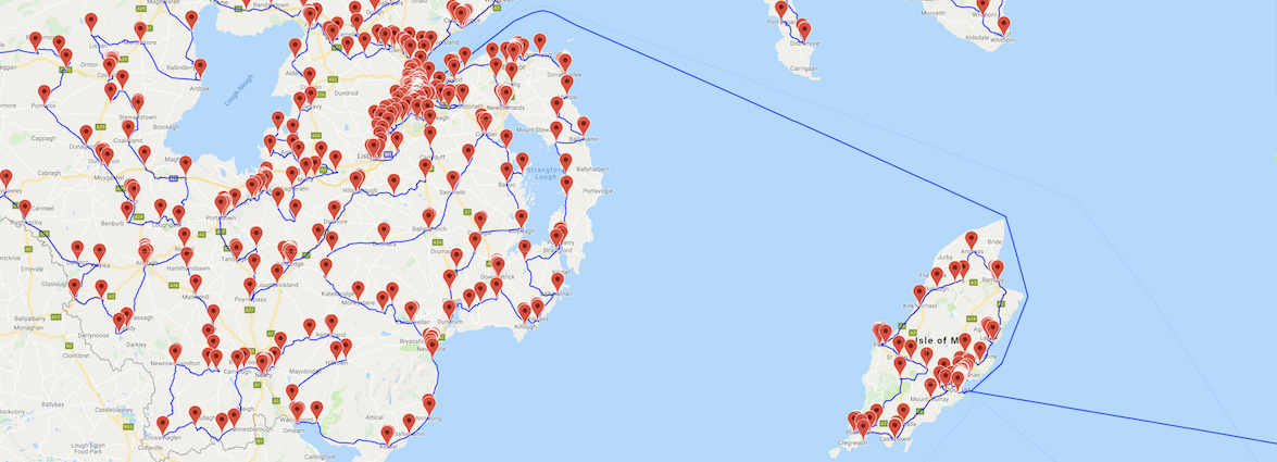 There are many dense portions of the tour, where you can shout from one pub to the next. But four of the legs are each over 100 kilometers, including long ferry rides. The top two are trips to and from the Shetland Islands, followed by the journey from Douglas, on the Isle of Man, over to Belfast, and a trip from Heysham in England over to Douglas.