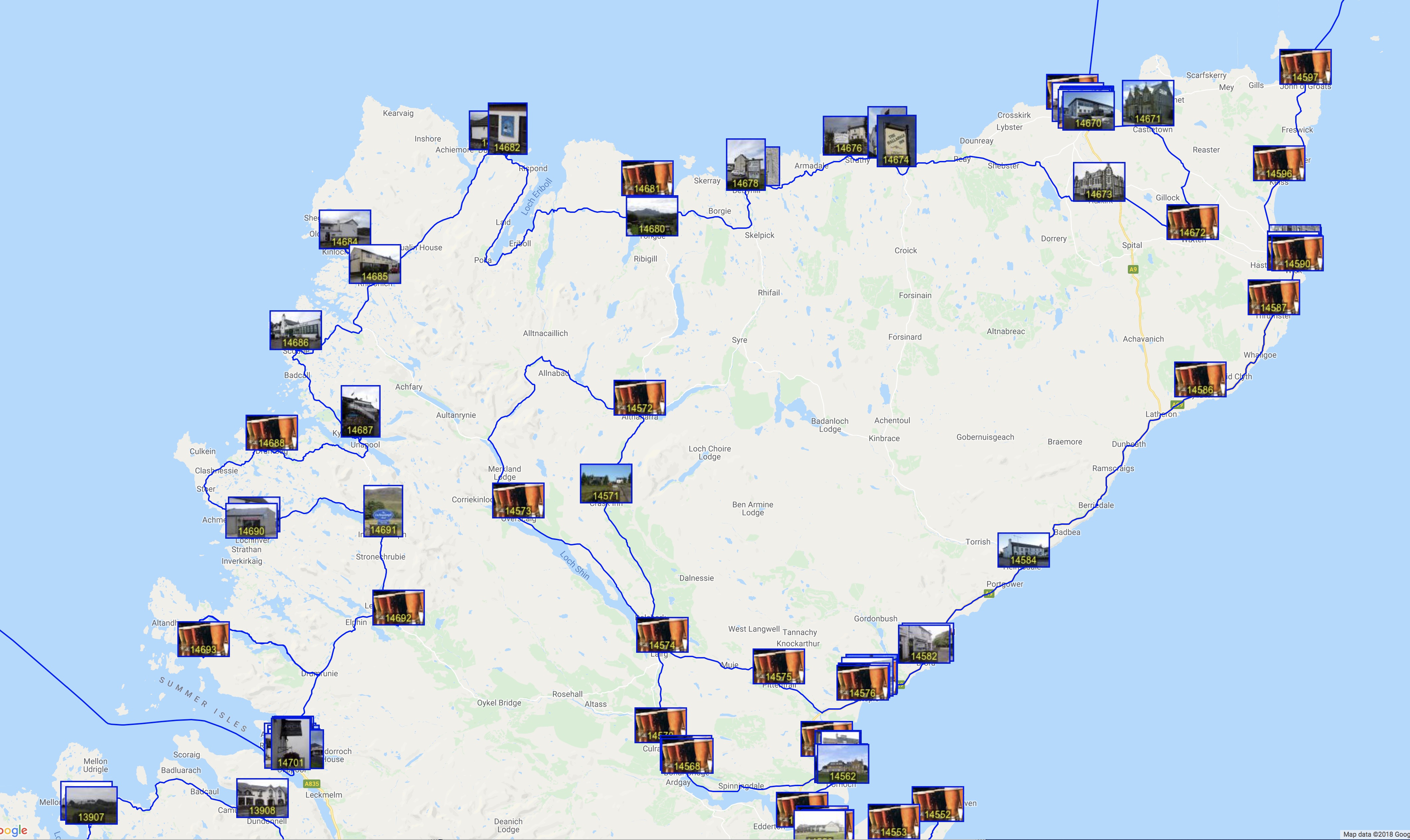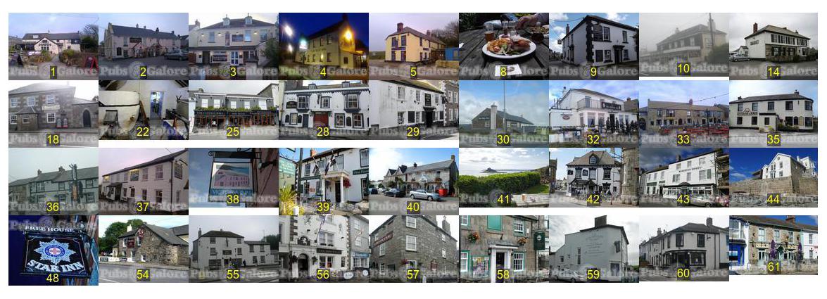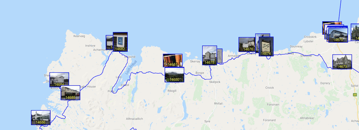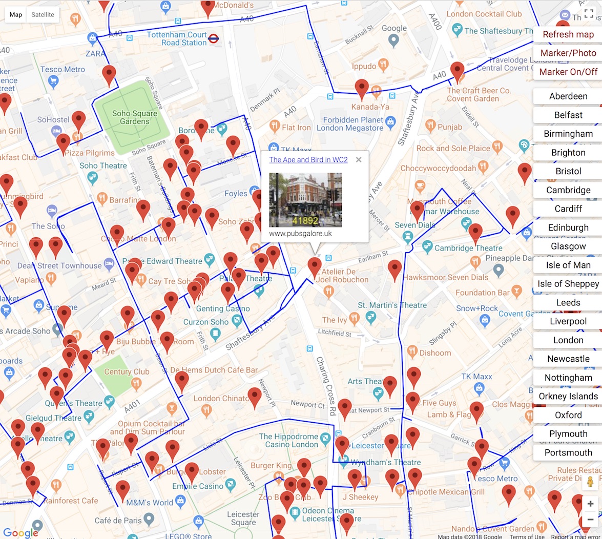 If you are zoomed in on a region, then you might want to click the Marker/Photo button. This will replace the standard markers will thumbnail images. The number on the bottom of each image indicates the pub's position in the tour. Click the Marker/Photo button again to return to standard markers.