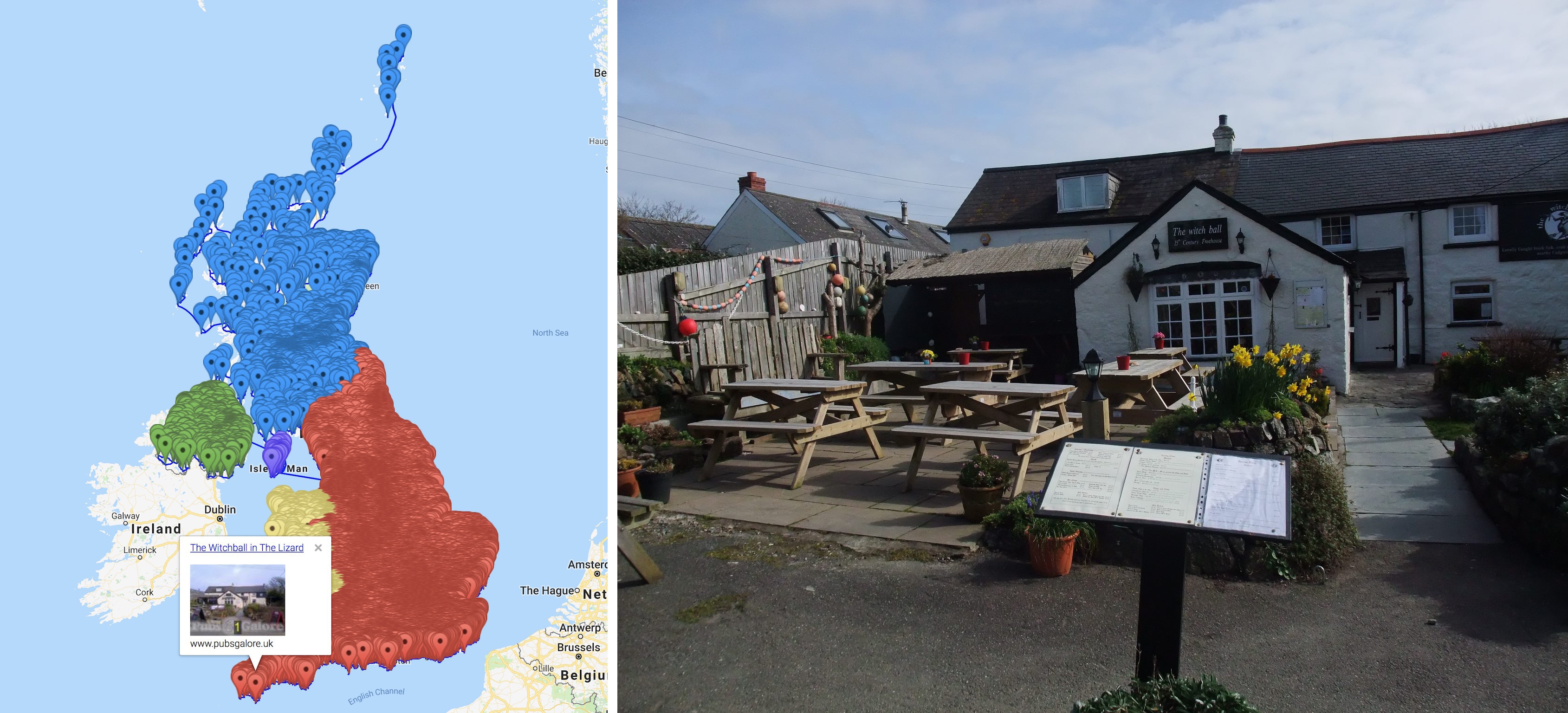 A beauty of a traveling salesman tour is that it returns to the starting point. The route is circular. A traveler can start at any point in a journey to see all 49,687 pubs. In our list, the 1st pub is the Witchball in Cornwall, England. Their web page reads "Welcome to the Witchball, the most southerly Pub in mainland Britain". You want to head over there on a Friday for fresh local fish prepared by chef Mitch Chandler.