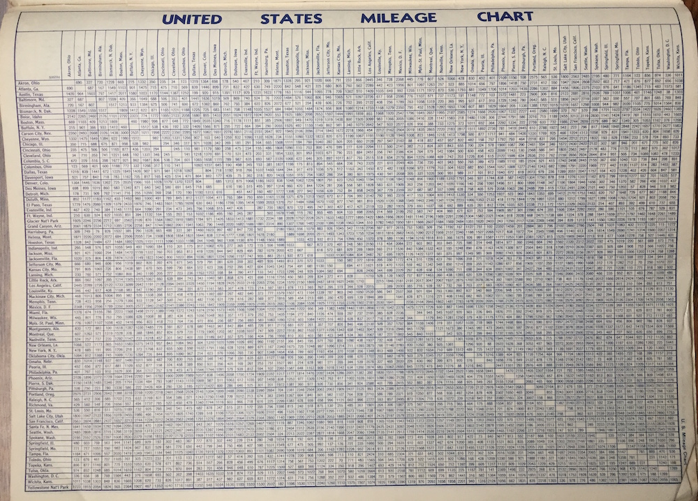 I was able to buy a 1954 Rand McNally Road Atlas on eBay. It contains a mileage table for 60 cities, with partial information for 15 others. In a close-up view you can read the point-to-point driving distances. Now compare this with the distance matrix from the original paper by Dantzig et al. What you see is that the numbers in the paper are much smaller.