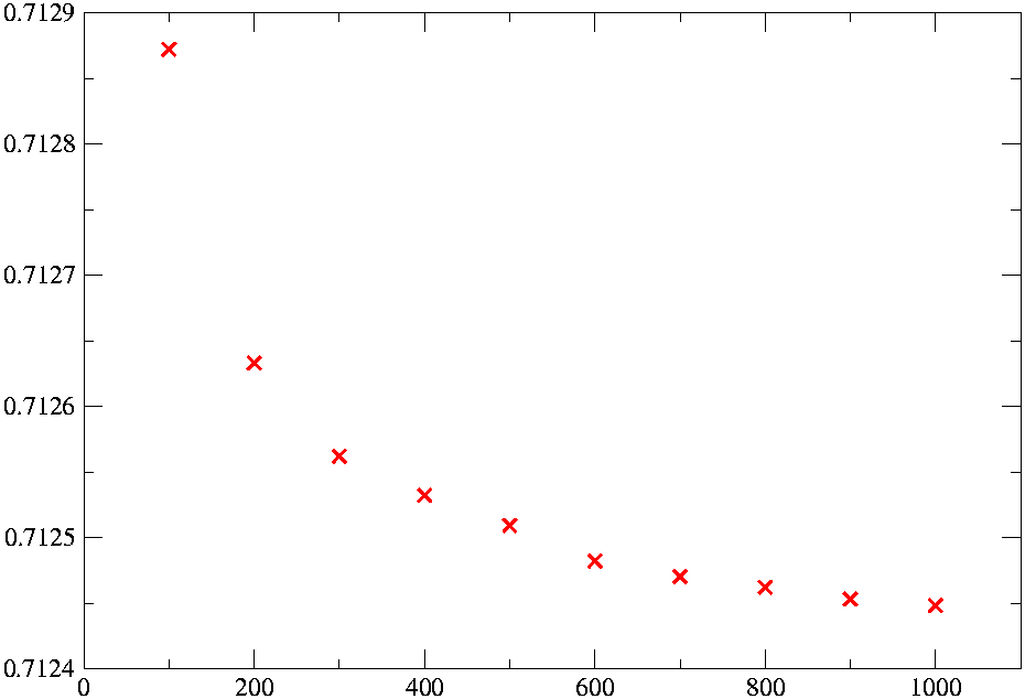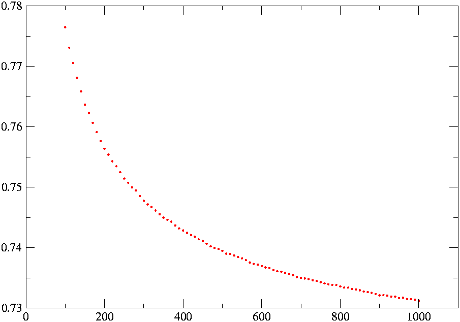 Fitting with gnuplot to f(x) = beta + a/sqrt(x) + b/x (with n >= 100), gives beta = 0.712029, a = 0.58816, b = 0.568922