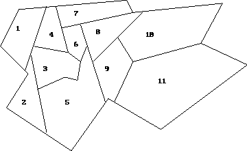 In this problem, we will integrate the set covering and transportation problems to solve the optimal flight plan problem. We are given an area to search as shown in the figure below. The entire area is divided into 11 smaller regions. We need to model the figure as a set covering problem to find which regions the plane should be so that the camera can cover the whole area. Then, we take the optimal solution and find the best route to travel within those regions.