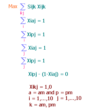 In this extension of the original problem, the ratings given by the teachers and the schools are different for the two sessions. The structure of the problem, including the definition of sets, variables, objective function and the constraints are similar to the core problem. The only modification to this extension is data as represented in the score table. That is, the score table for the afternoon session is different from the one for the morning session. Please refer to the model formulation on the previous page.Mathematical Model