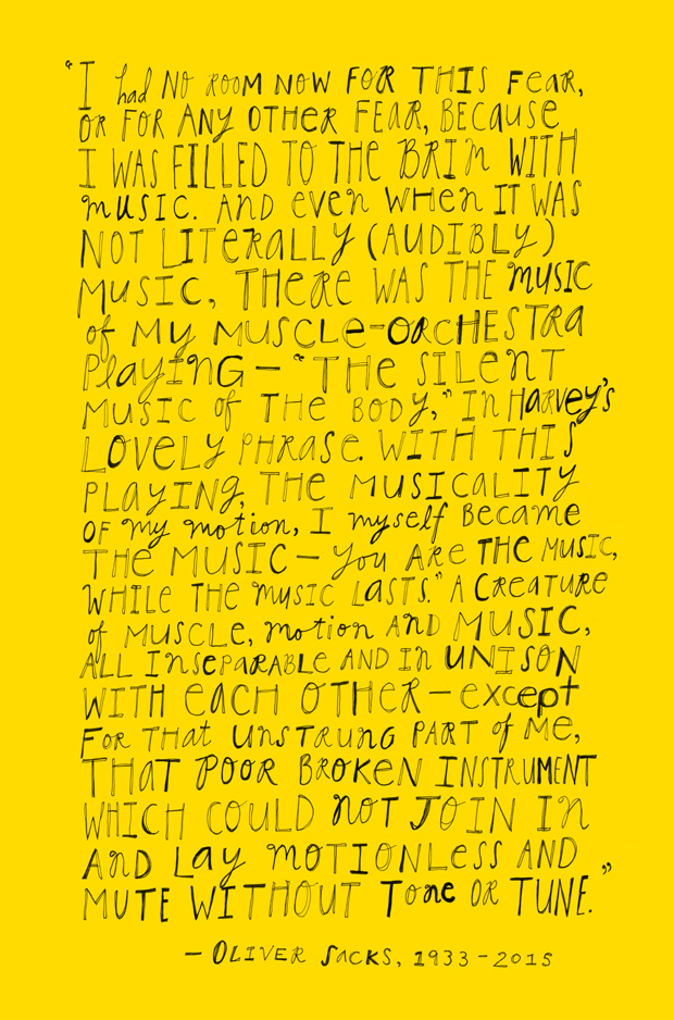 The book, made all the more poignant by Dr. Sacks’s death shortly after its release, is not so much an autobiography in the strict sense as a dialogue with time on the simultaneous scales of the personal (going from world-champion weightlifter to world-renowned neurologist), the cultural (being a gay man looking for true love in the 1960s was nothing like it is in our post-DOMA, beTindered present), and the civilizational (watching horseshoe crabs mate on the beaches of City Island exactly as they did 400 million years ago on the shores of Earth’s primordial seas). This record of time pouring through the unclenched fingers of the mind’s most magnanimous patron saint has become one of the most rewarding reading experiences of my life — one I came to with deep reverence for Dr. Sacks’s intellectual footprint and left with deep love for his soul.