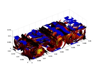 The basic flow does not remain simple for long, and indeed a linear theory leading to an eigenvalue problem can be constructed to show this mathematically. The simulations show how the disturbance evolves. In the upper panel you can see three billows form as denser fluid is pulled over lighter fluid. The billows interact and twist each other (middle panel) and a chaotic state eventually emerges (bottom panel). Sometime around the time of the middle panel the flow begins to three-dimensionalize. The picture on the right shows a surface of constant density in shades of yellow and brown and regions of strong interaction with the top and bottom boundary in blue.