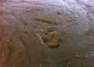 Turbulence is often presented as “the last unsolved puzzle of classical physics”, probably as a sort of hyperbole designed to compete with the hyperbole commonly used to describe particle physics. Perhaps a more useful analogy is turbulence as its own state of matter. Certainly the turbulent state is readily observed all around us and does have peculiar and unique features. For example it mixes fluid properties like temperature and chemical concentration very efficiently. It is also very nearly self-sustaining through the mechanism of vortex stretching. Think of the two pictures above taken of the local river at spring flood. The one on the right, with flow from left to right past a stick, has clear features associated with the waves, the spray that results from their breaking and other less coherent features generated by the disturbance to the main flow that the stick induces. However, even in this picture disturbances not associated with the stick are evident. In the picture on the left, there is no clear causal mechanism. What I tried to capture are the boils, or kolks, on the surface as coherent vortices impact the free surface from below. These occurred quasi-periodically and the whirlpool like features ranged in size from a centimeter or so to several tens of centimeters.