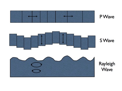 Elastic solids support several different types of waves. Inside the material there is the possibility of two qualitatively different wave polarities. The first is called a compressive or P wave. For a plane wave of this type the particle motion is in the direction of wave propagation (the top diagram above). If you have a Slinky type toy, this is the type of wave you make by stretching the toy a bit and then pushing one end toward the other. The second type is called a shear, or S wave. In a plane wave, individual particles move perpendicular to the direction of wave propagation (the middle diagram above). Using a Slinky you would generate this wave by moving the spring side to side.