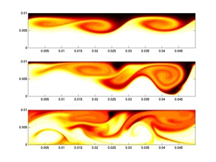 The basic flow does not remain simple for long, and indeed a linear theory leading to an eigenvalue problem can be constructed to show this mathematically. The simulations show how the disturbance evolves. In the upper panel you can see three billows form as denser fluid is pulled over lighter fluid. The billows interact and twist each other (middle panel) and a chaotic state eventually emerges (bottom panel). Sometime around the time of the middle panel the flow begins to three-dimensionalize. The picture on the right shows a surface of constant density in shades of yellow and brown and regions of strong interaction with the top and bottom boundary in blue.