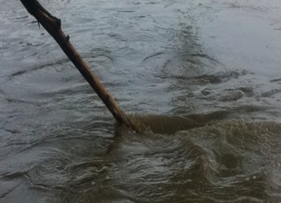 Turbulence is often presented as “the last unsolved puzzle of classical physics”, probably as a sort of hyperbole designed to compete with the hyperbole commonly used to describe particle physics. Perhaps a more useful analogy is turbulence as its own state of matter. Certainly the turbulent state is readily observed all around us and does have peculiar and unique features. For example it mixes fluid properties like temperature and chemical concentration very efficiently. It is also very nearly self-sustaining through the mechanism of vortex stretching. Think of the two pictures above taken of the local river at spring flood. The one on the right, with flow from left to right past a stick, has clear features associated with the waves, the spray that results from their breaking and other less coherent features generated by the disturbance to the main flow that the stick induces. However, even in this picture disturbances not associated with the stick are evident. In the picture on the left, there is no clear causal mechanism. What I tried to capture are the boils, or kolks, on the surface as coherent vortices impact the free surface from below. These occurred quasi-periodically and the whirlpool like features ranged in size from a centimeter or so to several tens of centimeters.