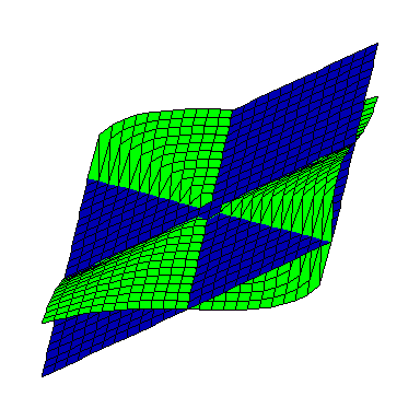 plot3d([surd(x^3+y^3, 3), x+y], x = -1 .. 1, y = -1 .. 1, color = [green, blue])