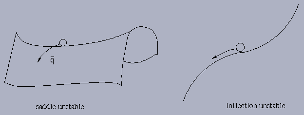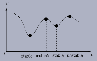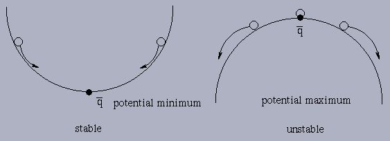 In general, the potential minima yield stable equilibria and maxima yield unstable (hyperbolic) equilibria. >